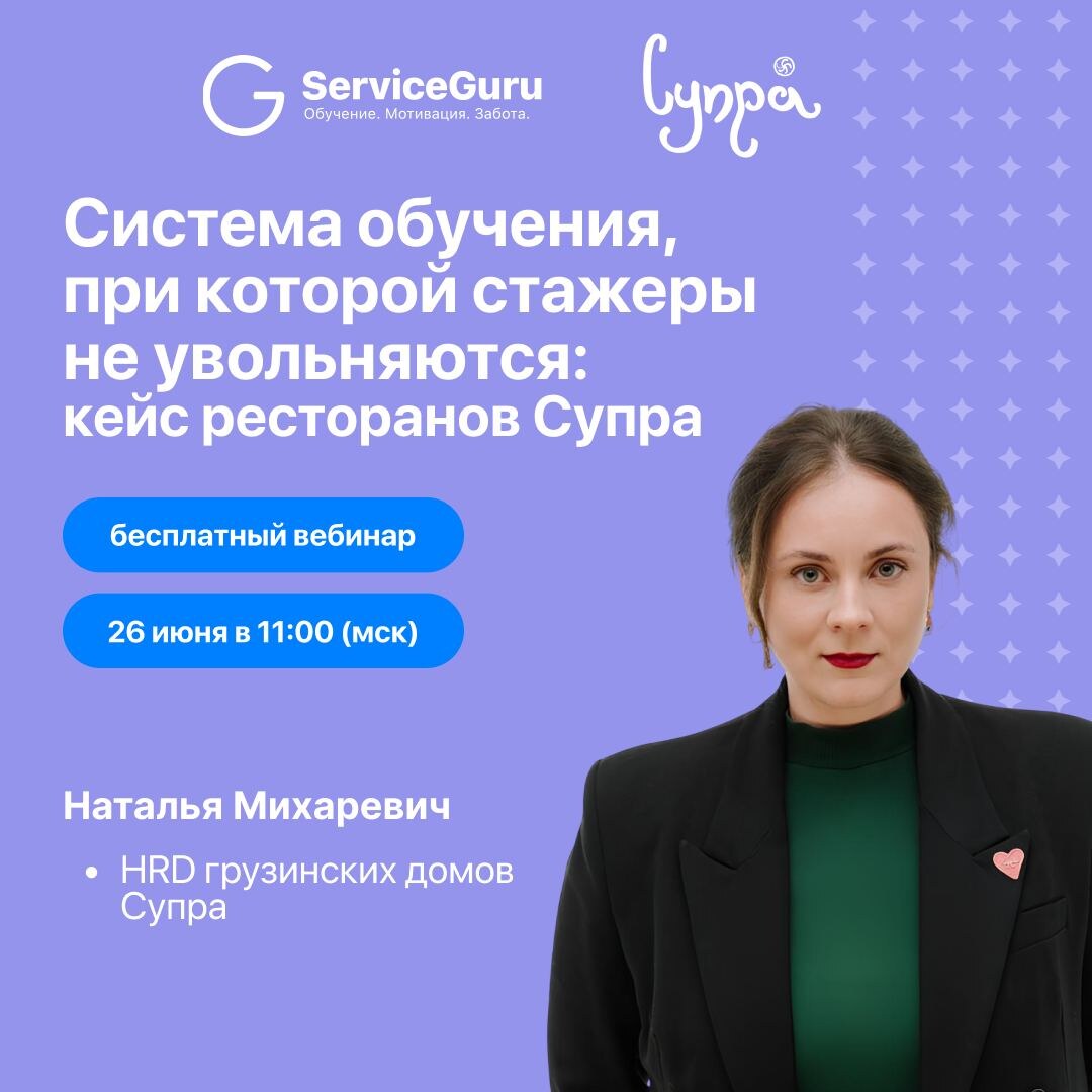 😀🐵🐒🐵🐕 Вебинар-кейс! Заглянем в самое сердце легендарных ресторанов Супра 💗. Слава об их HR-бренде, уникальной системе работы с командой и уровне сервиса гремит на всю Россию! В Супре даже в эру кадрового голода не просто набирают персонал, а строят команду по ценностям и растят звезду из каждого сотрудника✨ Как? ❗️26 июня в 11:00 мск расскажет Наталья Михаревич🎙, HRD грузинских домов Супра, сертифицированный Executive coach ICF. Что обсудим? ✅Снижаем текучку на 15%: как не просто набирать персонал, а подбирать сотрудников по ценностям и влюблять их в компанию? ✅От оффера до выхода в смену в 3 раза быстрее: как мы строим систему адаптации? ✅Почему наша система наставничества реально работает? ✅Готовые шаблоны документов и рабочие инструменты: письмо с оффером, путь стажера, структура адаптационных встреч и ключевые метрики эффективности. 📎Регистрируйтесь сейчас и забирайте подарок: 📕Дневник стажера Супры!