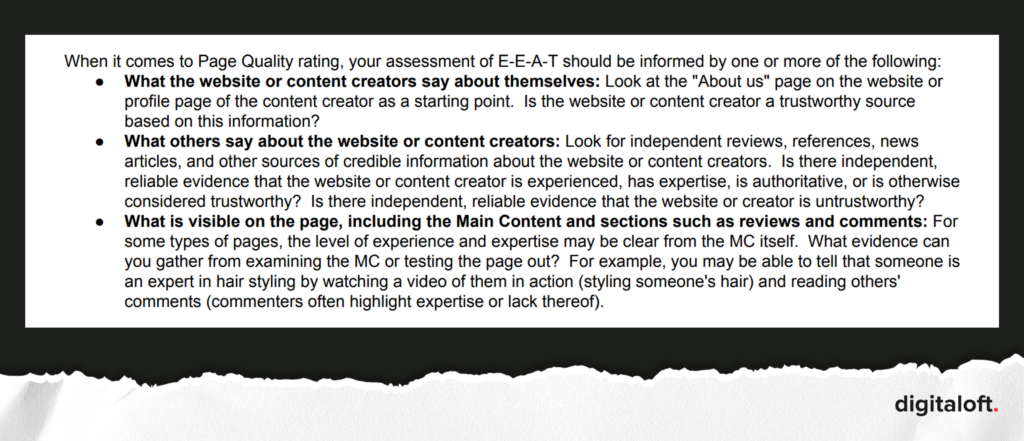 Когда дело доходит до оценки качества страницы, ваша оценка E-E-A-T должна основываться на одном или нескольких из следующих факторов: