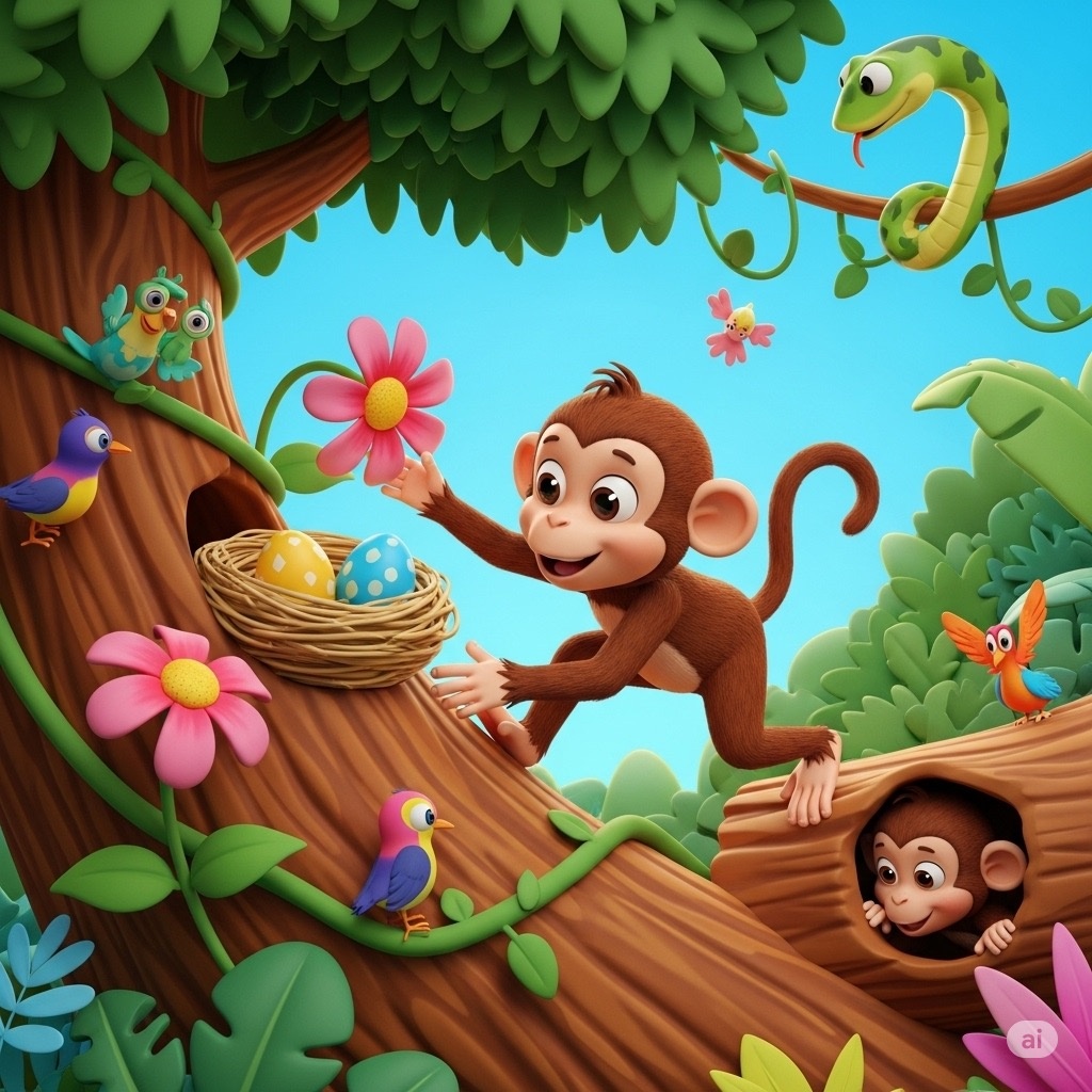 Была одна обезьянка — непоседа, как все обезьяны. Всюду она лазила, всюду совала свой нос. Однажды увидала обезьянка груду камней, и одолело её любопытство. «Надо узнать, что здесь спрятано!» Раскидала камни, и открылась дыра. Сунула неугомонная туда свою лапу — не попадётся ли что-нибудь лакомое,— а из дыры выползла огромная змея! Выбралась змея из мрачного заточения и как зашипит, как бросится на обезьянку. «Дурная моя голова!— бранит себя обезьянка.— Ну чего я полезла в эту дыру? Уж не кувшин ли масла думала найти?» — Сжалься надо мной, великий дракон!— стала она молить змею.— Знала бы, что здесь ваши владения, никогда не осмелилась бы нарушить ваш покой! Но разве может змея пожалеть? Какая же она тогда змея! — Нет тебе прощения!— прошипела она.— Ты разбудила меня и только смертью искупишь свою вину! В эту самую пору мимо них шла лиса. Обезьянка была наслышана про лисьи уловки и остановила её. — Пускай мудрая лиса рассудит наш спор,— говорит несчастная обезьянка. — Ладно, скажи, лис
