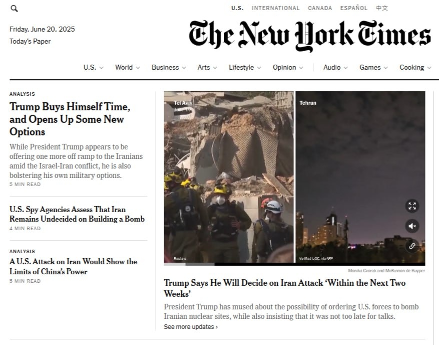 Посмотрим на передовицы мировых медиа 🤨 Невнятные кадры разрушенных зданий на WSJ; рядом - работа израильской бригады медпомощи на WP. Аналогично - Bloomberg: портрет Трампа с кулачком в руке. Все три арта весьма блеклые 🤨 Бодренькие вертикальные видео-заставочки на NY ударов Ирана по Израилю 🤨 Разорванный флаг Ирана на The Economist 🤨 Шикарный цветной портрет Хомейни на кроваво-красном фоне разрушенных домов у Financial Times 👍 И мой выбор - коллаж с Трампом, Ираном, Израилем и США на The Atlantic 🚫 Наслаждаемся! Стоп вар! Suum cuique Wars not make one great Democracy Dies in Darkness #хайп_дня #мировая_война Рогов Илья 🇷🇺