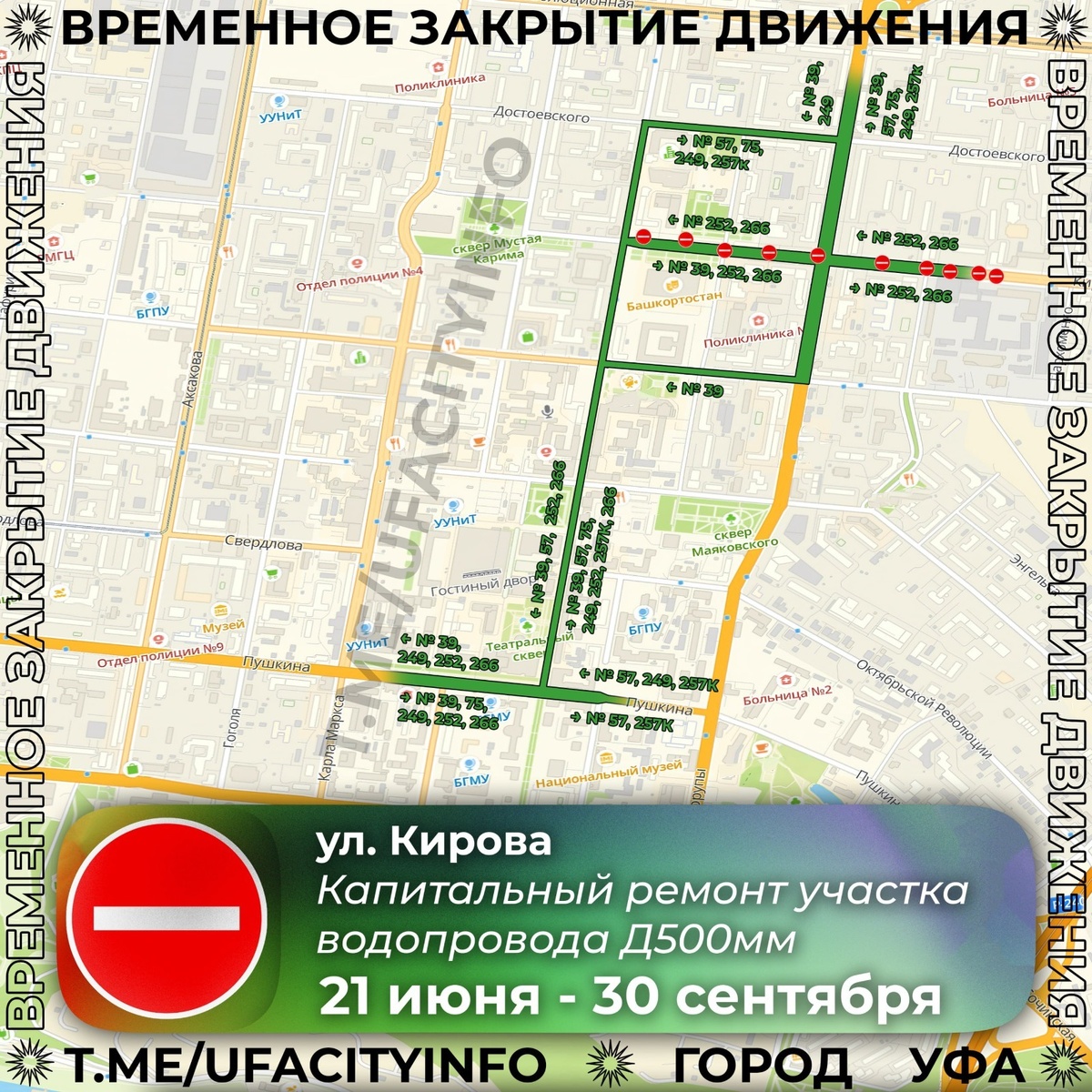 В Уфе на улице Кирова с 21 июня по 30 сентября пройдут работы по ремонту водопровода в рамках национального проекта «Инфраструктура для жизни»