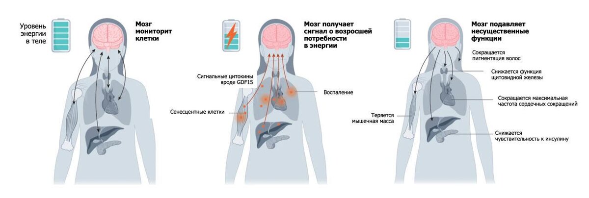 Мозг — не про мысли, а про энергию Интересная теория последних лет говорит: главная задача мозга — управлять энергией тела, а не размышлять или философствовать. ▪️ Мозг — главный диспетчер: он координирует всю биохимию организма, решая, куда пойдет энергия. ▪️ Стареющие клетки (сенесцентные) не просто «умирают» — они становятся активными участниками диалога с мозгом. ▪️ Они выделяют молекулу GDF15 — сигнал, что пора сэкономить. Мозг воспринимает это как приказ «режь расходы»: – уменьшается пигментация волос (появляется седина), – сокращается мышечная масса, – тормозятся другие «неприоритетные» функции. Учёные подчеркивают: всё не так просто, не стоит сводить старение к одной молекуле. Но этот механизм — один из важных фрагментов в большом пазле долголетия. #энергетика #биохимия #GDF15 #нейроэнергетика