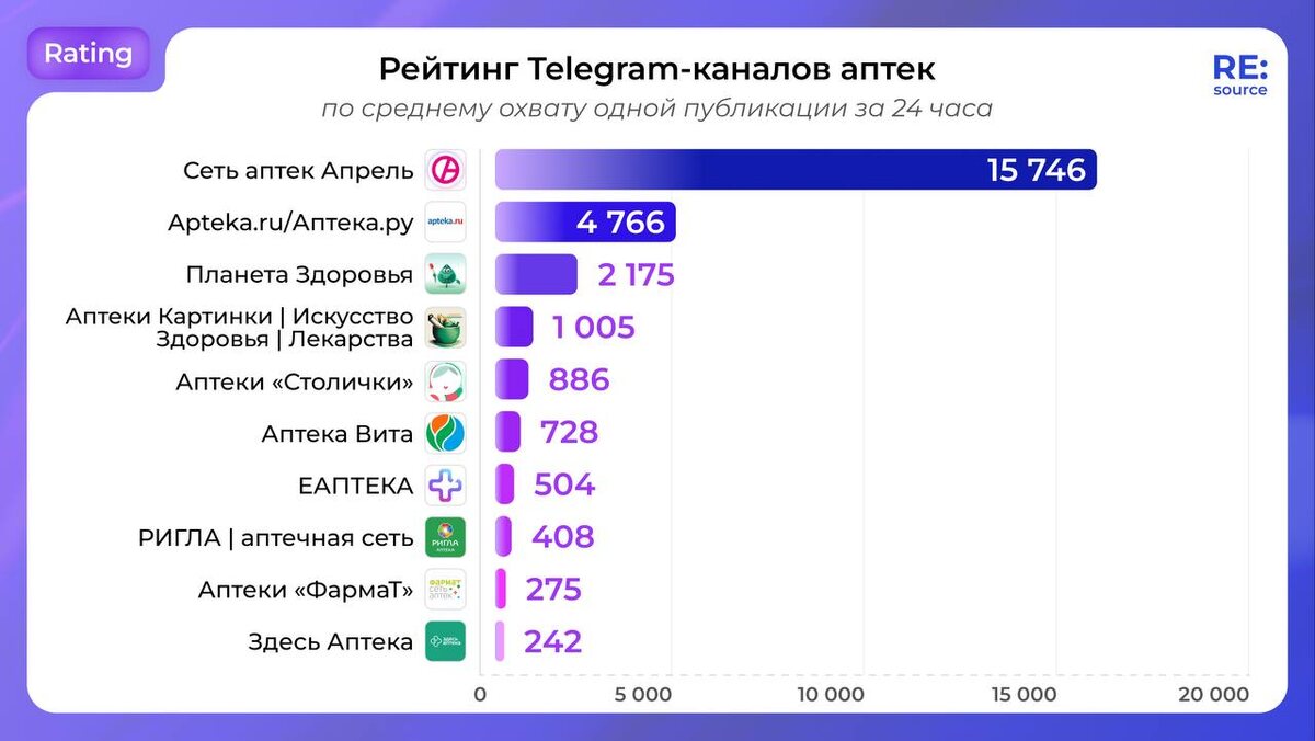🔹🔹🔹 Канал сети аптек «Апрель» — самый охватный, а канал сети «Планета здоровья» — самый виральный в Telegram В канале «Планета здоровья» действительно образцовый контент для аптек. Там проходят конкурсы, рассказывают про классную аптечную косметику и делятся полезными промокодами — готовая стратегия вирального контента для фармы. Однако по охватам безусловным лидером с большим отрывом все же стала сеть аптек «Апрель». Известные всем ЕАПТЕКА и Аптека.ру расположились в середине рейтингов. А закрывает рейтинги и по охватам, и по репостам «Здесь аптека». Возможно, они все еще в поисках SMM-щика… Рейтинги Telegram-каналов из других сфер: 💻 EdTech 🍿 Онлайн-кинотеатры 🚖 Сервисы такси Источник: TGStat #TGrating Подписаться на RE:source