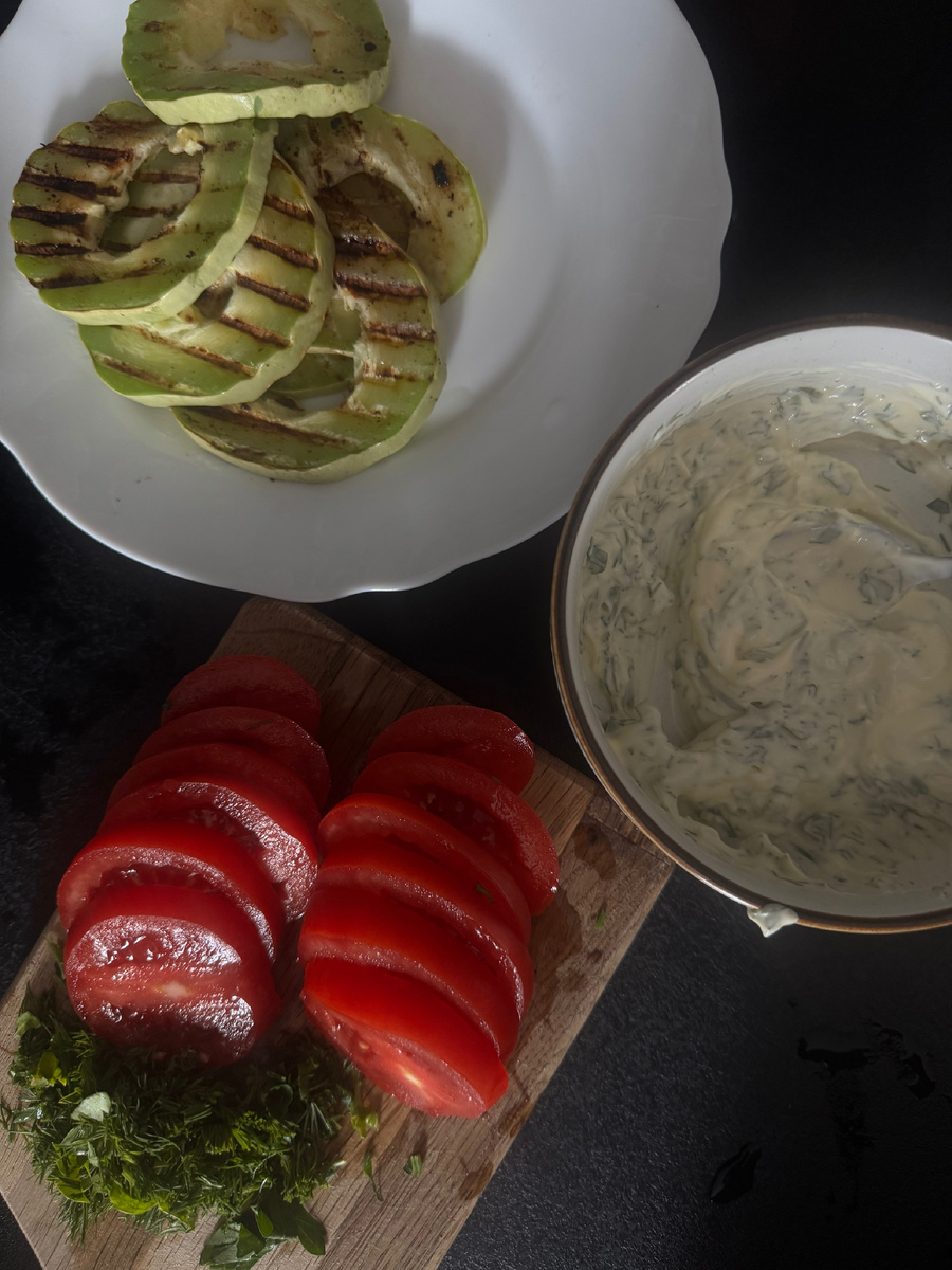 - Жареные кабачки с чесноком и сыром. Кабачок нарезается кружочками, обжаривается с двух сторон, сверху выкладывается смесь сметаны, тёртого сыра и рубленой зелени с чесноком.