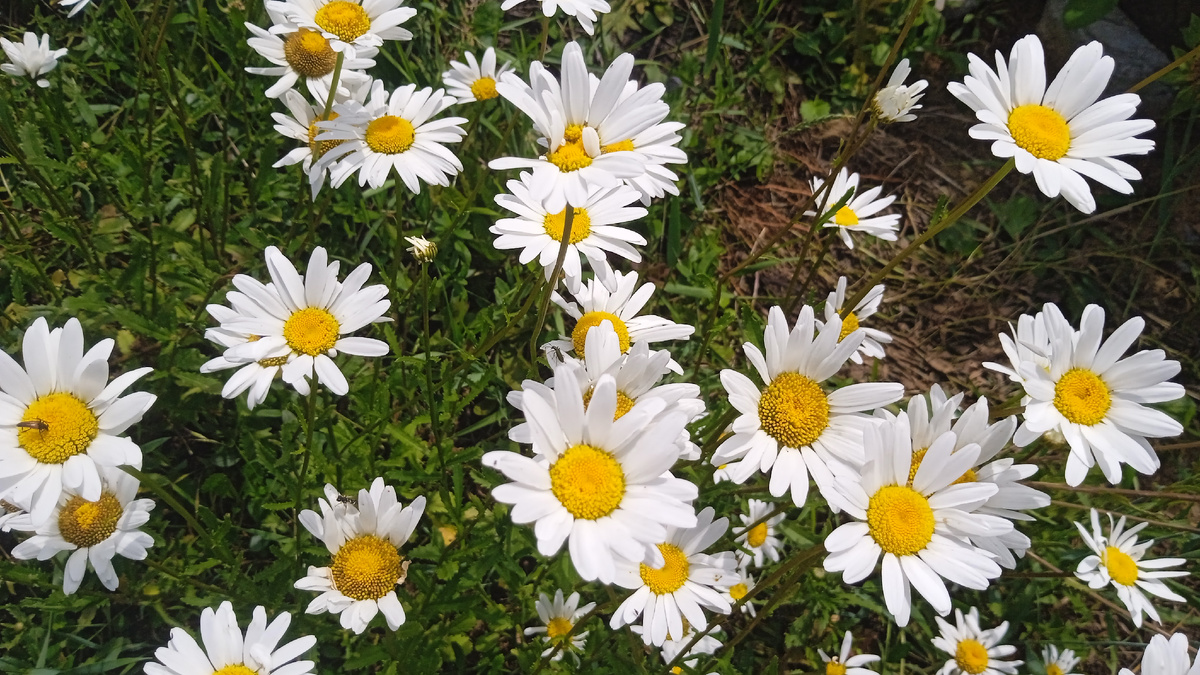 А у меня ромашки – повсюду! В саду они скромно выглядывают из разных уголков, словно маленькие солнышки, рассыпавшиеся по зелёному ковру.