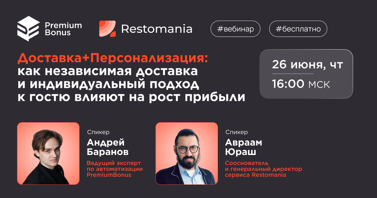 📆 Дата: 26 июня ⏰ Время: 16:00 📣Спикер: Ведущий эксперт по автоматизации, Андрей Баранов (PremiumBonus) 💥Приглашенный эксперт: Сооснователь и генеральный директор сервиса Restomania, Авраам Юраш Хотите внедрить прибыльную доставку и выстроить эффективную коммуникацию с гостями? Тогда фиксируйте дату! 26 июня в 16:00 мы проведем эксклюзивный вебинар, на котором вы узнаете как оптимизировать процесс доставки и какие возможности открывает персонализация! Тайминг: 45 мин. выступления + 30 мин. общение со спикерами в прямом эфире. Используйте уникальный шанс обсудить свои вопросы с ведущими экспертами! 🎁Приятный бонус! В конце вебинара разыграем полезные подарки: 1. Скидка на сервисы Restomania и PremiumBonus до 30% 2. Аудит CRM-маркетинга + час с экспертом ➡️Регистрация по ссылке.