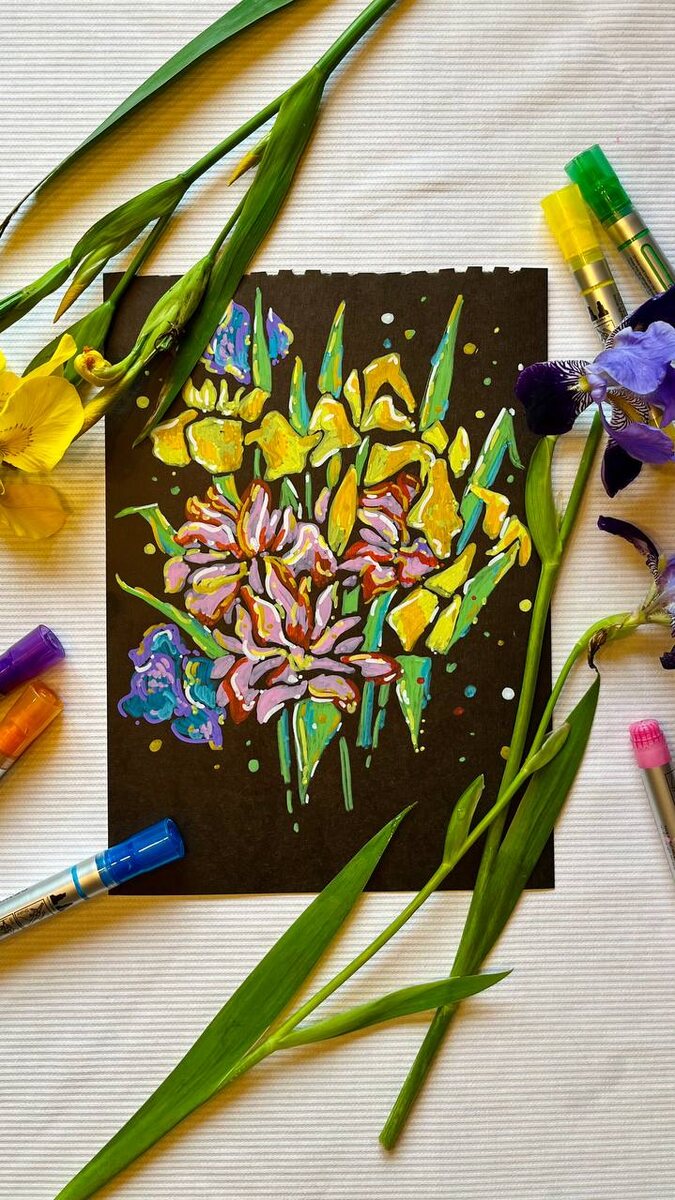 … Пете и Фёдор делали аппликацию, а я зарисовала ирисы и пионы на чёрной бумаге акриловыми маркерами 🪻