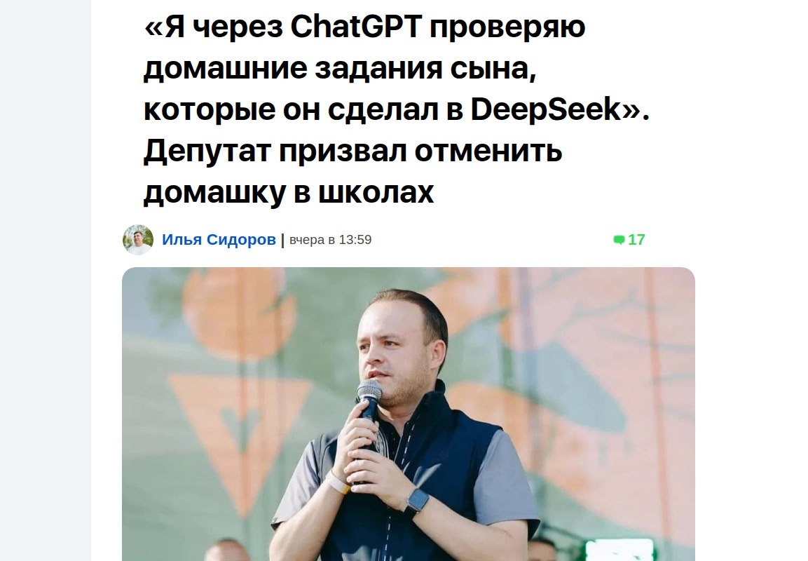 «Я проверяю через ChatGPT домашку сына, которую он делал в DeepSeek»: депутат предложил отменить домашние задания Депутат Госдумы Владислав Даванков выступил с радикальным предложением — полностью отменить домашние задания в школах из-за повсеместного использования ИИ. «Это абсолютная бессмыслица. Я через ChatGPT проверяю домашние задания сына, которые он сделал в DeepSeek. В текущем виде домашние задания давно пора отменять», — заявил депутат. Может он прав ? via