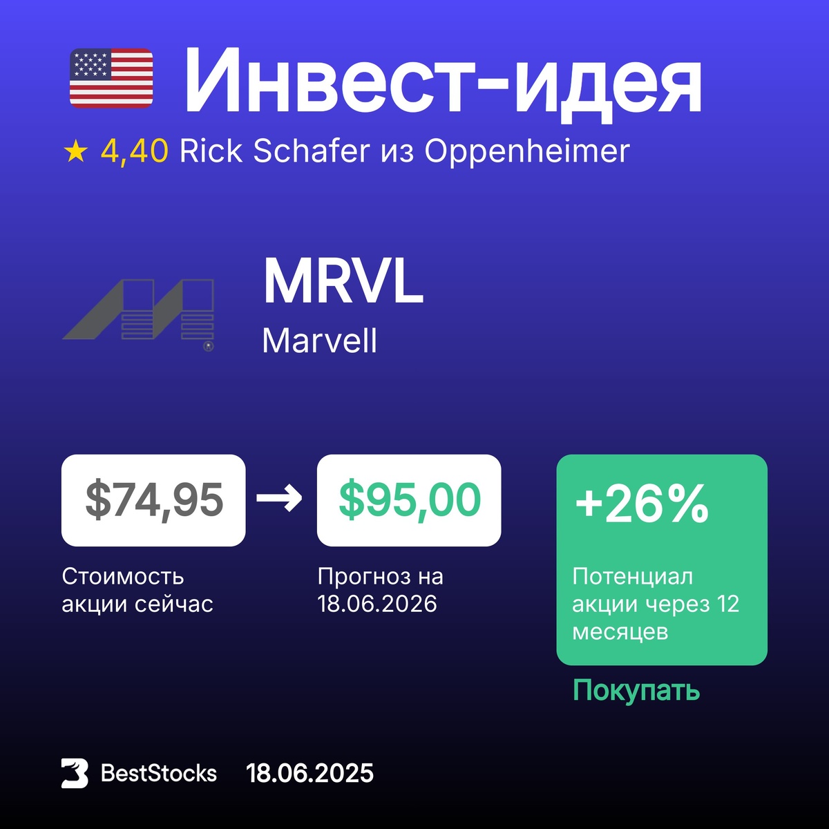 🇺🇸 Инвест-идея по акции Marvell Тикер: MRVL Прогнозная цена: $95 (+26%) Рекомендация: Покупать InvestRank акции: 6 из 10 Прогноз сделан: 18.06.2025 Прогноз до: 18.06.2026 Инвест-компания: Oppenheimer Аналитик: Rick Schafer Ещё рекомендации на сегодня → ••••• ⚡️ Новый функционал на сайте — 🇷🇺 Какие русские акции в тренде. Узнайте, какие бумаги из России получили больше всего рекомендаций за последнюю неделю.
