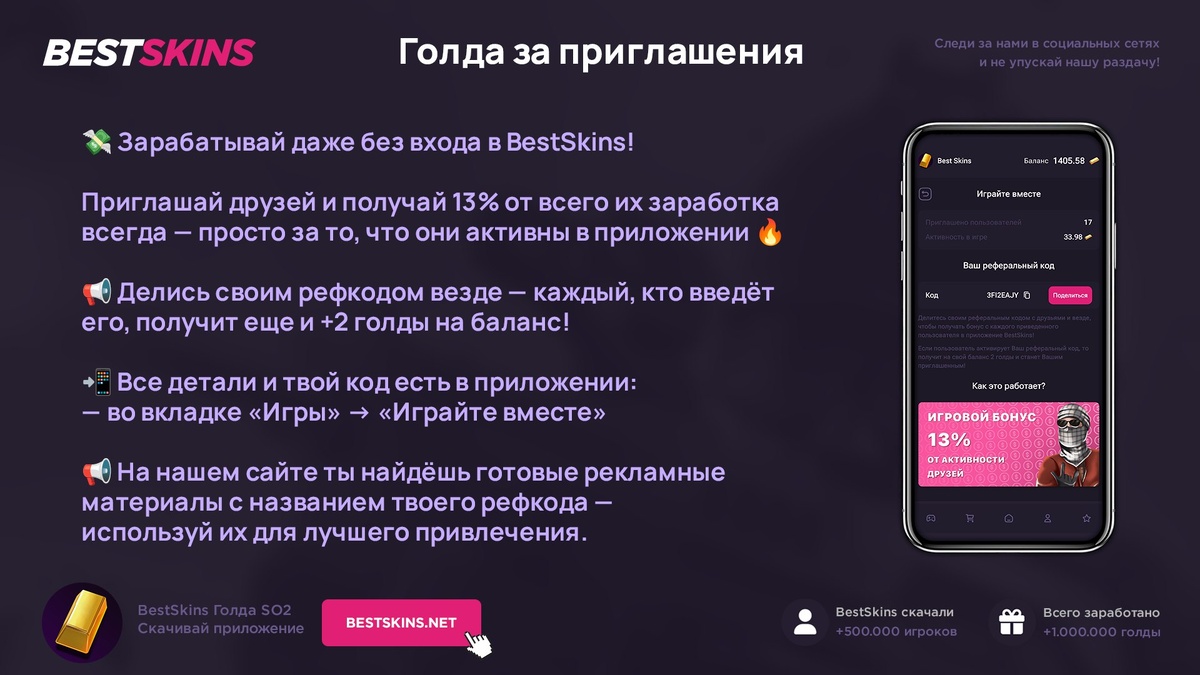 Голда за приглашения в BestSkins SO2 Зови игроков и получай 13% от их фарма! 💸 Фарм идёт даже без входа — просто рекламь 🚀 🖼️ Баннеры — bestskins.net/articles/referalka 📲 Скачать - https://bestskins.net