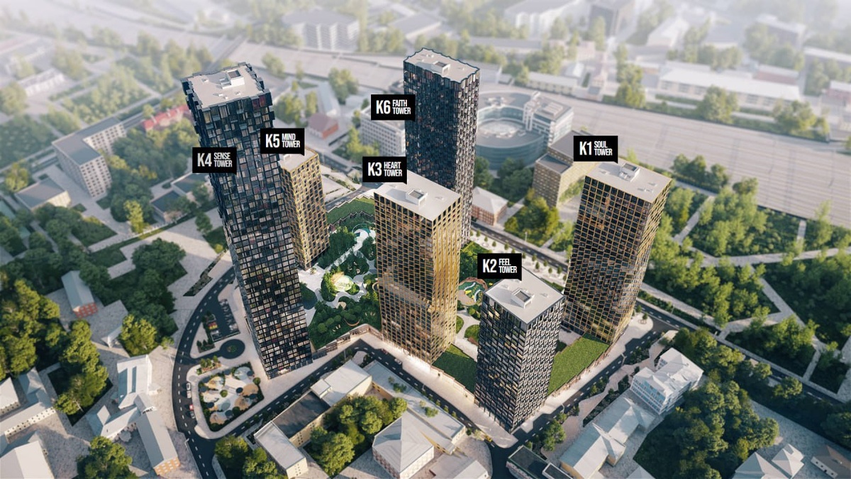 Речь идёт о трёх корпусах высотой 24 (корпус № 2) и 32 этажа (корпуса № 1, 3). Внутри 629 квартир. К настоящему моменту в продаже доступно не более 20% лотов.