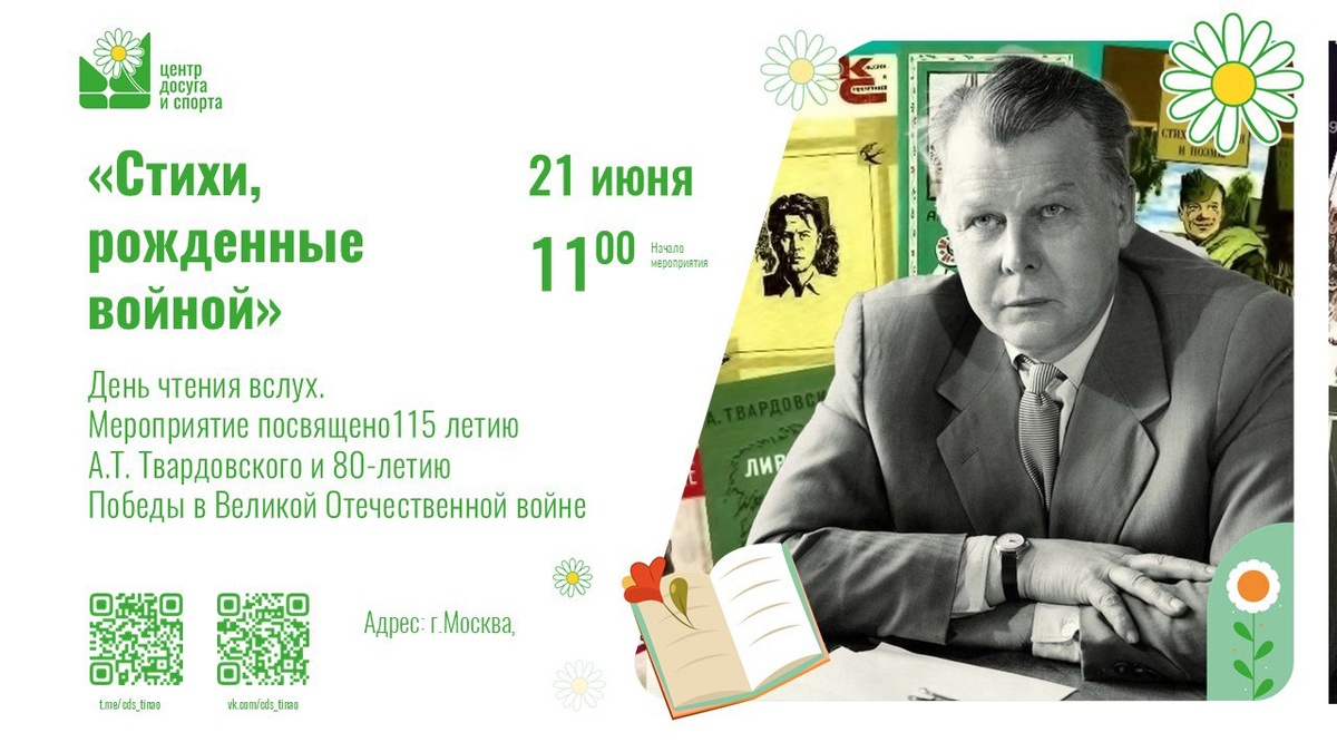 "Прикоснитесь к истории и поэзии вместе с библиотекой СП "ДК "Дружба"! 21 июня приглашаем вас на мероприятия, посвященные 115-летию А.Т. Твардовского: • 11:00 - "Стихи, рожденные войной": пронзительные строки о мужестве и героизме в День чтения вслух. • "Произведения Твардовского": книжная выставка, раскрывающая творческий путь писателя.