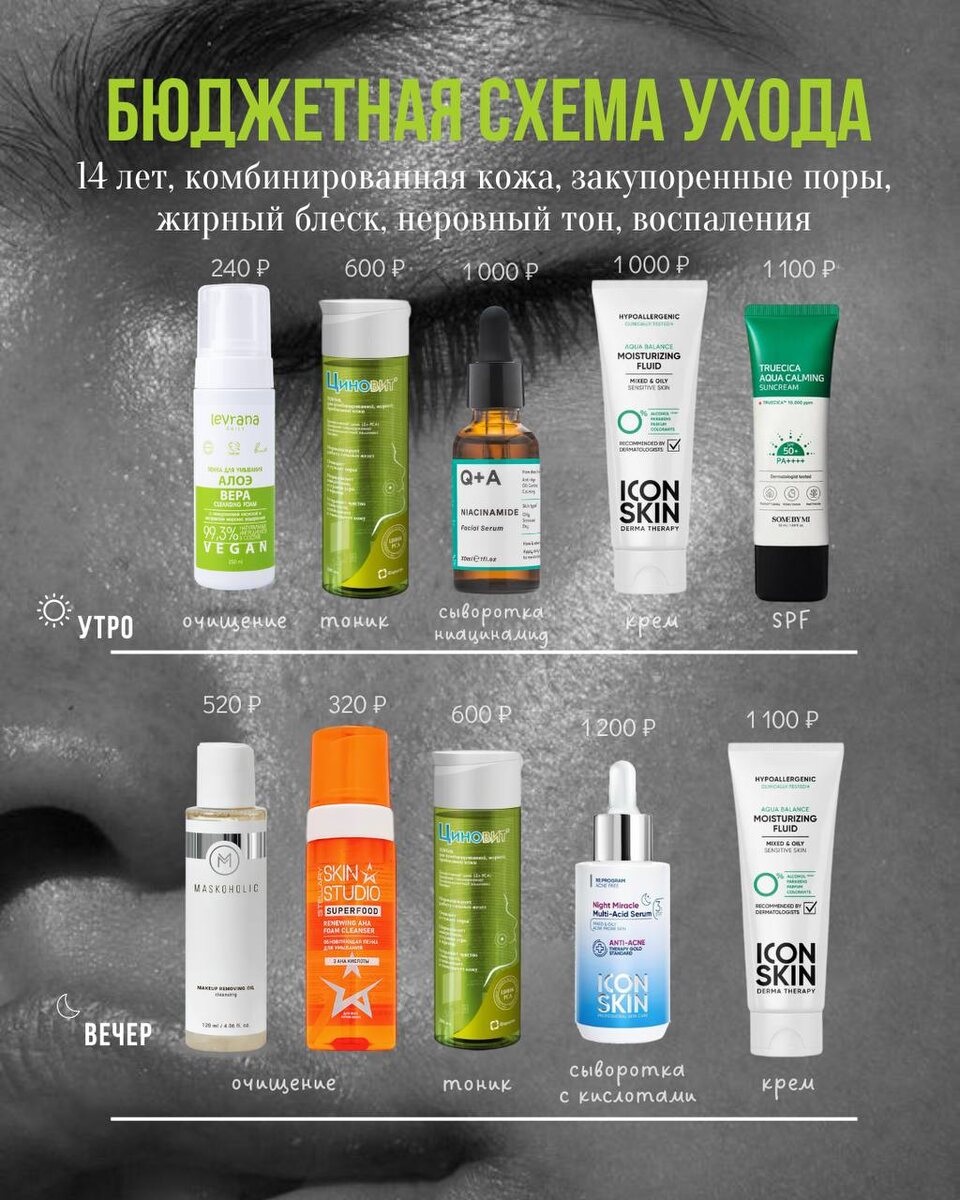 Вообще, для подростков самое главное - это мягко очищать, увлажнять кожу и защищать от солнца. Но тут у нас еще есть воспаления и повышенная жирность, которую хочется убрать. Поэтому добавим кислоты (АНА и BHA), ниацинамид, цинк. Бюджет ограничен. Схема может быть такая: