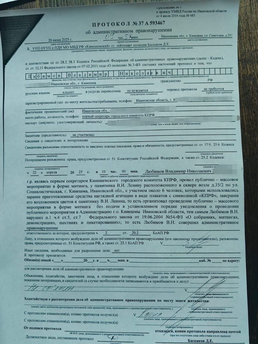 ⚡️Голодные игры «по-кинешемски». Власти объявили охоту на кинешемского лидера КПРФ⚡️ ☄️Сегодня в Кинешме развернулись настоящие «голодные игры» — только вместо арены с трибунами здесь кабинеты полицейских участков, а вместо смертоносных ловушек — административные протоколы. Первый секретарь местного горкома КПРФ Владимир Любимов в течение одного дня получил сразу три «подарка» от правоохранителей — протоколы о якобы незаконных митингах. ‼️Три протокола. Три разных полицейских. Три мероприятия, проведенных в разные дни. Но все оформлены 20 июня — словно кто-то нажал кнопку «старт» в этой странной игре. Однако вызывает вопросы тот факт, что все три протокола были составлены за события двухмесячной давности. Формально первые два касаются возложения цветов к памятнику Ленину 22 апреля, третий — за встречу с жителями 31 мая у детской площадки. ⚠️Безусловно, сроки составления протоколов вызывают серьезные сомнения в их процессуальной чистоте. Особенно если учесть, что в апреле-мае ни поли