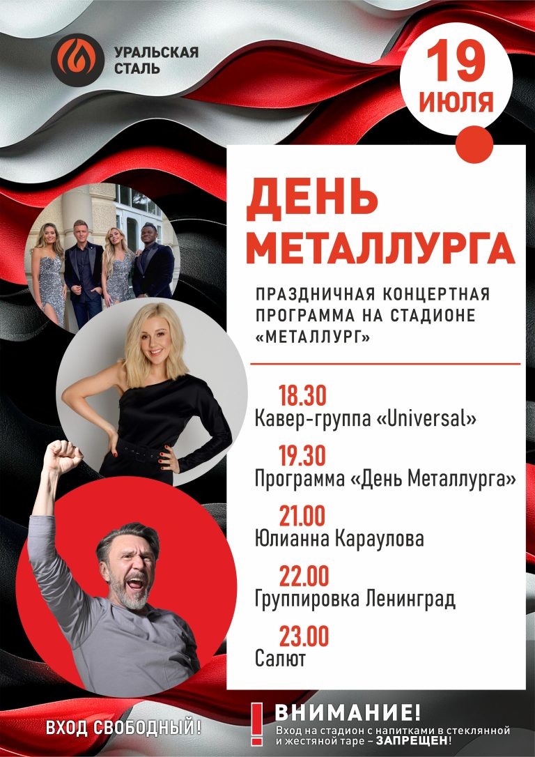 Праздничная программа и концерт будут посвящены в том числе 70-летнему юбилею Уральской Стали. День металлурга новотройчане будут отмечать в течение целой недели. Комбинат «Уральская Сталь» подготовил яркую праздничную программу. Так, 14-15 июля пройдут спортивные турниры для работников и ветеранов комбината. Не останутся в стороне и дети металлургов, отдыхающие в лагере «Родник». А 16 июля на Гала-концерте корпоративного конкурса выберут «Стальную королеву-2025». 17-18 июля на торжественных мероприятиях корпоративными, городскими и отраслевыми наградами будет отмечено около 500 металлургов. В субботу 19 июля в сквере на площади Ленина Новотроицка запланированы: масштабная праздничная детская развлекательная программа и фотовыставка. Уральская Сталь традиционно готовит яркие события для жителей и гостей Новотроицка. Этот год не станет исключением — кульминационным событием дня станет поздравление металлургов руководителями региона, города и компании на главном стадионе города. Для ново