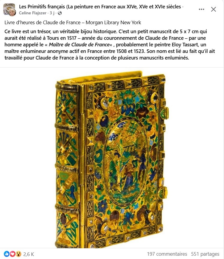 Путешествуя по Франции и общаясь с местными жителями, не раз слышала их рассказы о том, что тот или иной замок-шато в эпоху Великой Революции и Наполеоновских войн был разграблен практически полностью, вплоть до стен, камни которых народ вывозил для постройки собственных жилищ. Жалкие остатки былого великолепия в виде небольших груд булыжников можно увидеть и теперь. С той поры ситуация существенно изменилась: современные французы весьма дорожат своим культурным наследием и всячески его популяризируют. Недавно в соцсети обнаружила статью о шедевре французской книжной миниатюры - "Часослов королевы Клод Французской", созданном в 1517 году по случаю ее коронации. Восторг!!! Примечательно, что "жемчужина" французской культуры размером всего 5 х 7 см в настоящее время находится в собрании Библиотеки Моргана в Нью-Йорке. Этот факт вызвал живейшую дискуссию среди французских подписчиков: "Верните ее во Францию, потому что это наше достояние!" "Превосходная книга... но что она делает в Нью-