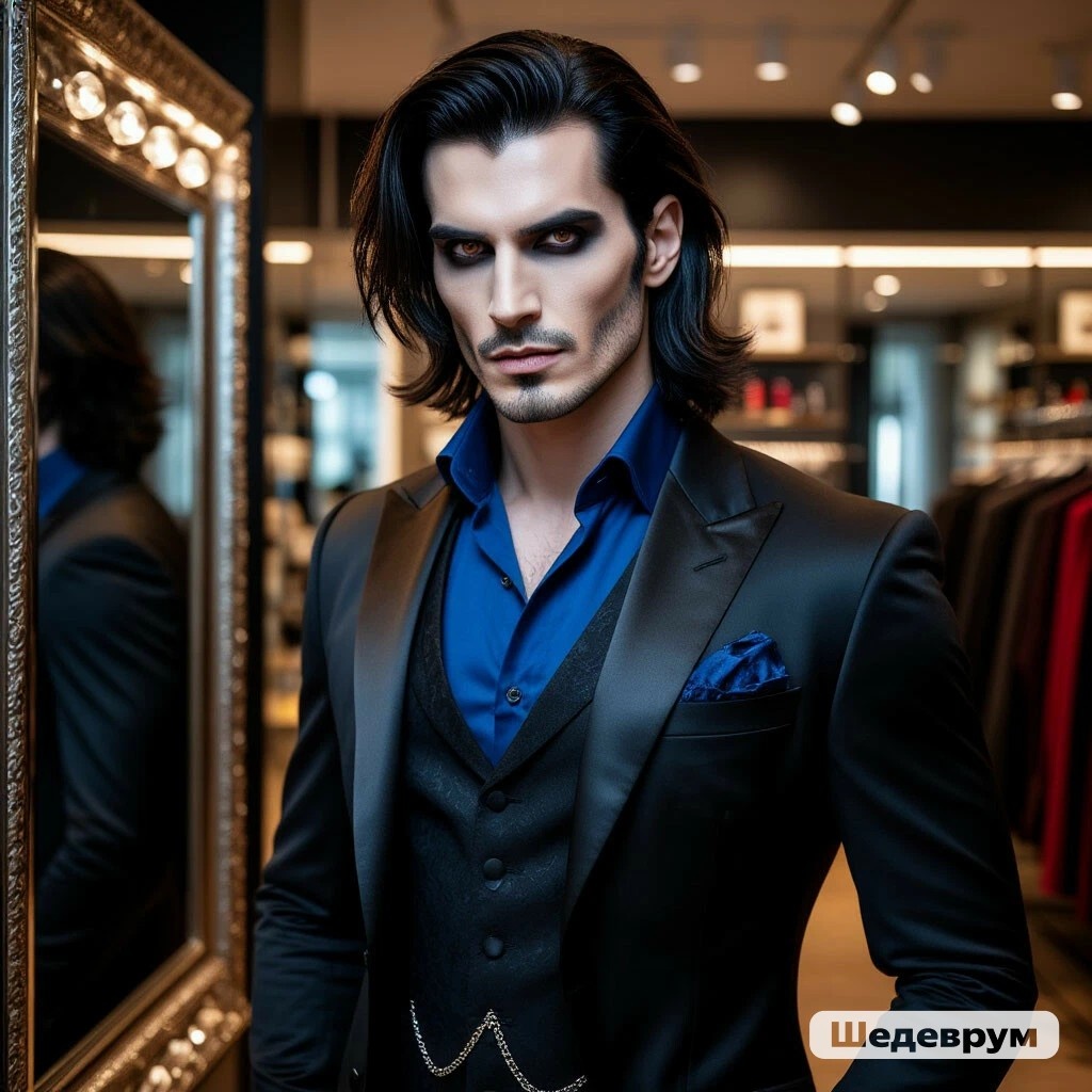 - Пройдемте в примерочную. - Сказала она, когда вампир оказался за шторкой, смотря на себя в зеркало. Он быстро развязал шнурок на сутане, снимая ее через голову, бросив на пол. Мужчина надел на тело атласную синюю рубашку, застегивая ее, потом брюки, застегнув кожаный ремень с серебристой пряжкой, и надел пиджак, слегка потянув плечи назад, все сидело идеально, Рэмус пригладил руками волосы, сделав шаг назад. Решив выйти из примерочной, чтобы его внешний вид оценила продавщица и друг. Шторка открылась, и вампир вышел в зал, Кевин был настолько удивлен, его глаза через круглые очки стали казаться тоже круглыми.
