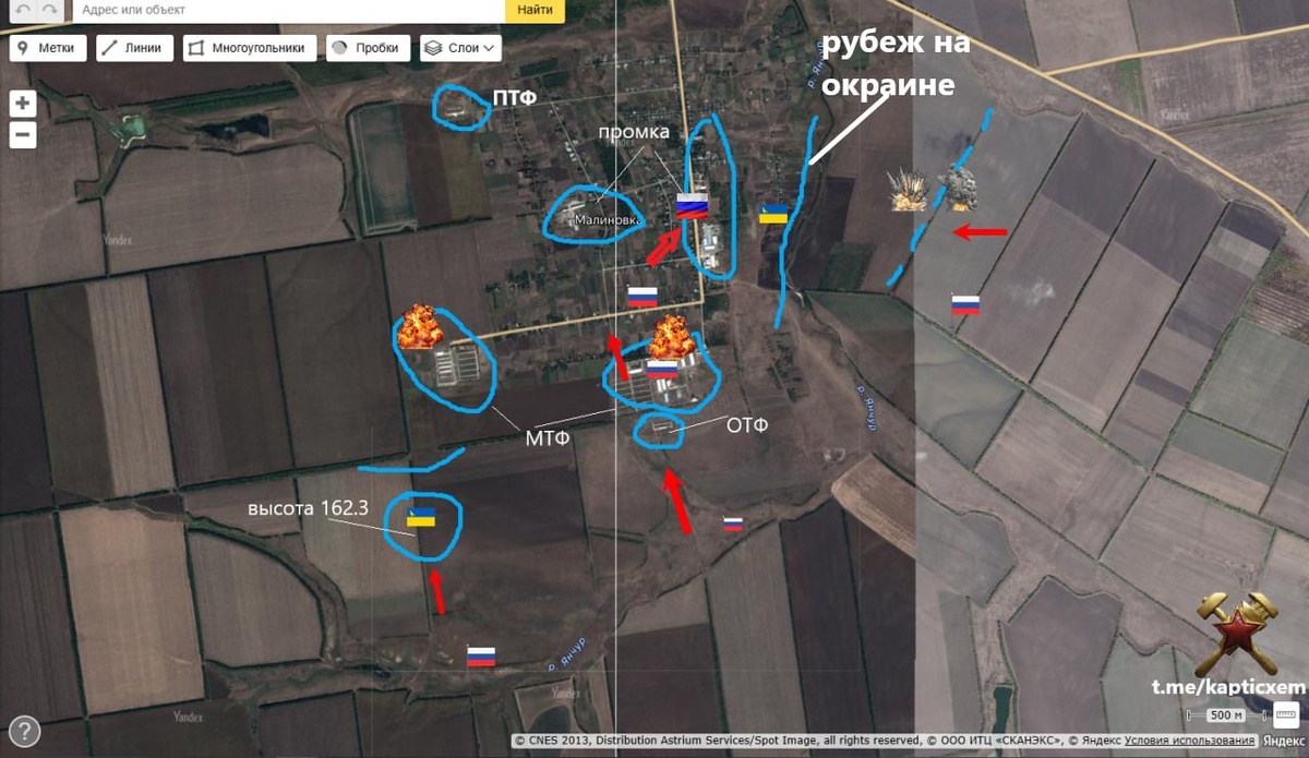 В ответ на пост ТГК"Сливочный каприз" дал привязку по Малиновке. Наши штурмовые отряды забрали у врага восточную промку на взгорке. Это выход в тыл рубежу ВСУ по первой линии домов поселка на востоке. Тем самым вся вражеская позиция взята в тиски. Шансов никаких. Можно начинать обратный отсчет, Малиновка на пути возвращения домой. схемы и карты
