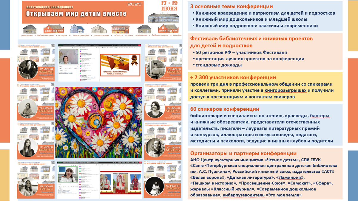 Мы рады поделиться итогами Всероссийской практической конференции «Открываем мир детям вместе», которая прошла с 17 по 19 июня 2025 г. и собрала +2300 участников – библиотекарей и специалистов по чтению, краеведов, блогеров и книжных обозревателей, представителей отечественных издательств, лауреатов литературных премий и конкурсов, иллюстраторов, педагогов, методистов и психологов, руководителей книжных клубов и родителей, объединённых одной целью — развитие детского и подросткового чтения.