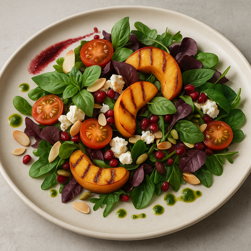 Летом на столе всегда есть что-то громкое: шашлык, бургер, стейк, кебаб. А салат? Часто стоит в миске сбоку, как бедный родственник. Но стоит один раз подать его красиво — и всё меняется. Он становится не «гарниром», а блюдом, к которому тянется рука первым. И это не магия. Это работа с текстурой, цветом, высотой и композицией. 1. Миска не должна быть глубокой. У нас как-то привыкли в основном подавать салат в огромных мисках. Но салат — это не борщ. Глубокая миска прячет слои и разрушает текстуры. Лучше всего работают широкие, плоские тарелки или блюда с лёгким бортом. Так видно всё: и орехи, и фету, и кусочки персика с гриля. 2. Цветовая палитра: соблюдай контраст. Никакой теории цвета — просто: • если салат зелёный, добавьте что-то жёлтое/красное: томаты, апельсины, редис, розовый лук; • если база — бежево-коричневая (крупы, мясо, булгур), нужен свежий зелёный акцент: мята, петрушка, фисташка; • сыр или йогуртовая заправка — белое пятно, на которое хочется смотреть; • чёрные маслины