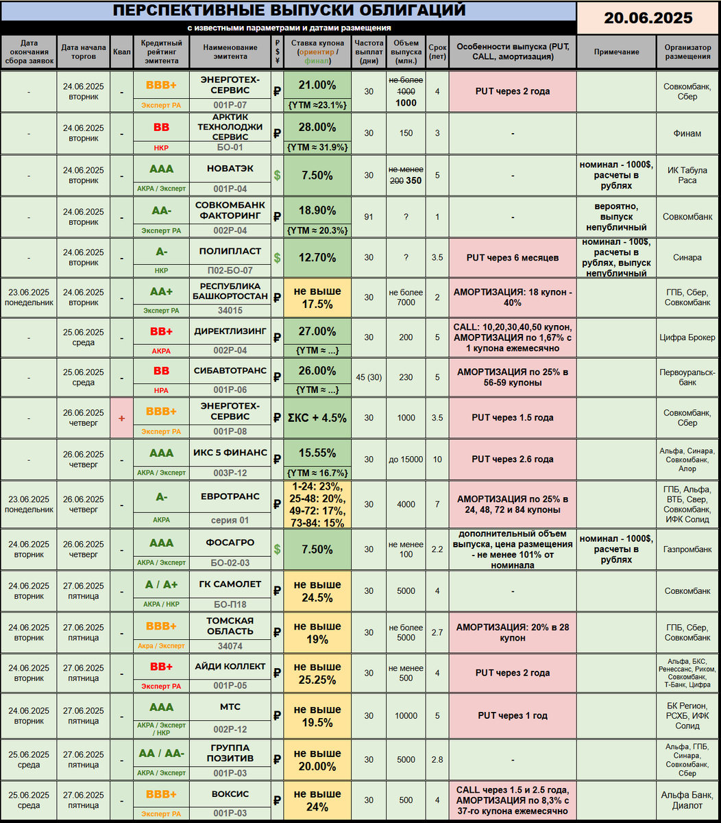 🔆 Также напомню, что ГРУППА ПОЗИТИВ (🅰️🅰️ / 🅰️🅰️➖) перенесла сбор заявок на свой выпуск 001Р-03 на 25 июня. Новая дата начала торгов - 27 число, а вот параметры пока не трогали: 2,8 года торгов, ежемесячный купон не выше 20, оферт нет, объем - 5 миллиардов рублей.