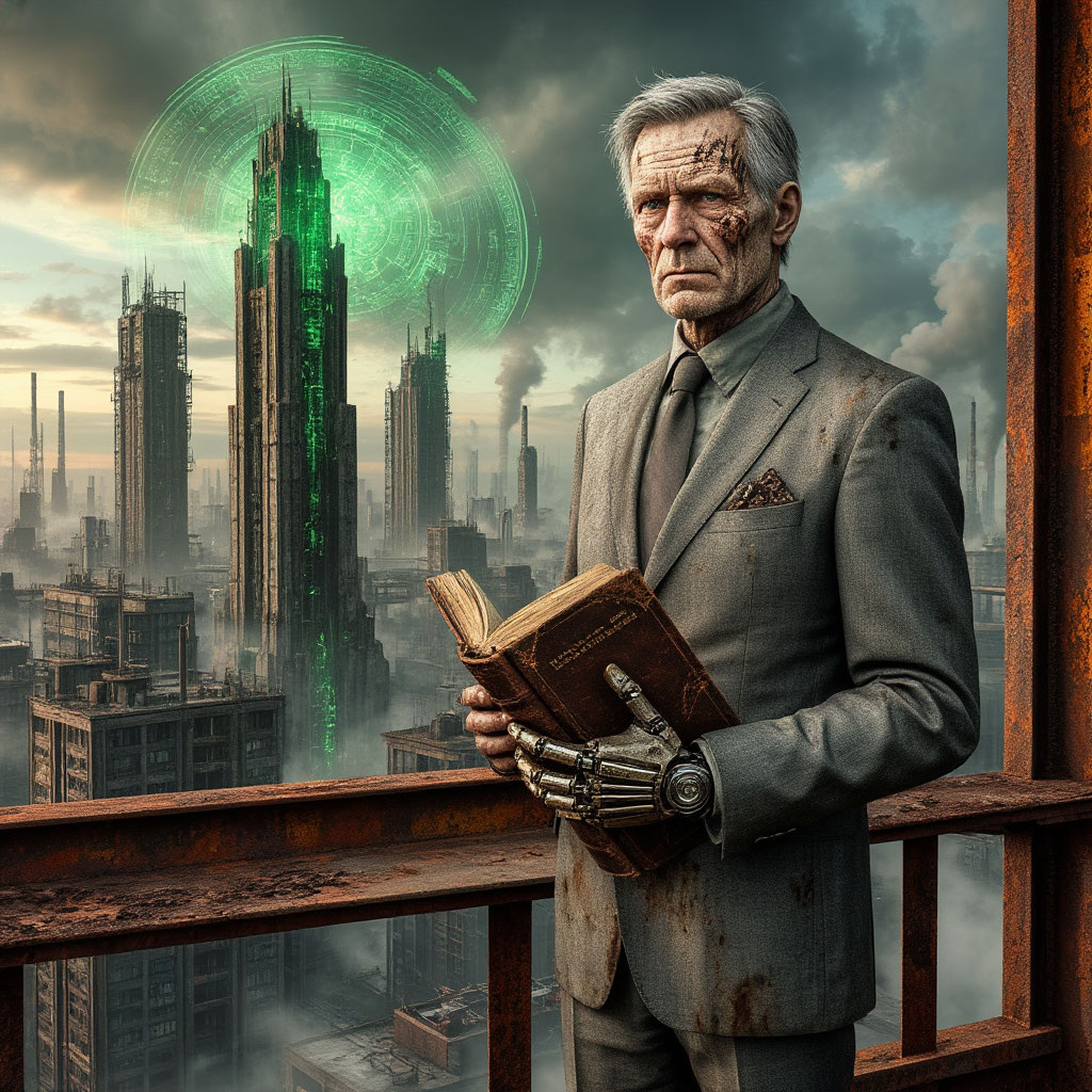 Эйвинд Гримссон сидел в шумной, пропахшей жиром «Зале Совета» – корпоративной столовой для сотрудников его уровня. Он ковырял вилкой «Угорь Локи» – серую, желеобразную массу с подозрительными зелеными прожилками. Пятьдесят лет легли на него тяжело: лицо изрезано глубокими складками усталости, кожа приобрела землистый оттенок дефицита солнца. На левом виске – аккуратный, чуть поблескивающий шрам от обязательного чипа «Лингва-Стандарт». Он работал, но порой вплетал в речь древние, мертвые слова, как короткое замыкание в памяти. Правая рука – бионический протез «Ультра-Эконом». Он функционировал, но скрипел при сгибании и периодически «зависал», роняя стакан с «Медом Бури» – шипучей жидкостью цвета антифриза. Эйвинд был старшим копирайтером отдела креативных нарративов. Его работа – ткать привлекательные мифы из цифрового праха для «Один-Консорциума». Вера в слова давно испарилась, осталась глубокая, костная усталость. Единственная слабость – ветхая бумажная книга, «Старшая Эдда», спрятанная под матрасом в его каморке. Ее страницы пахли сыростью подвала и чем-то неуловимо живым, как память о другом воздухе.