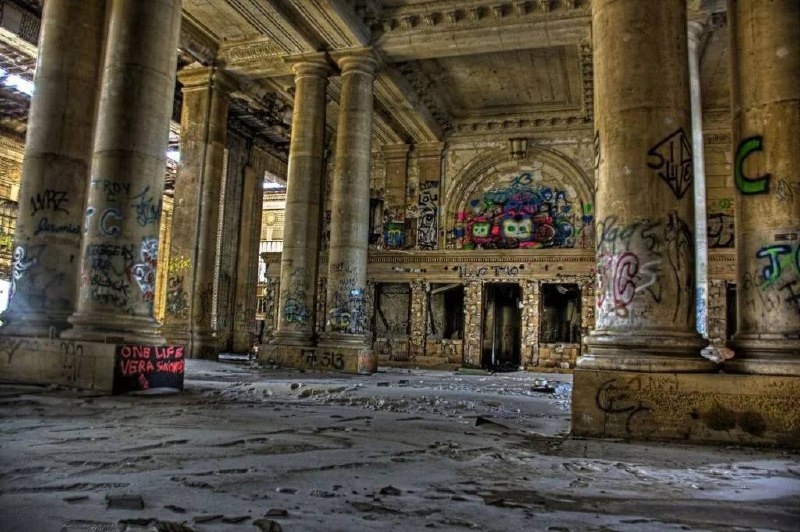 💡Центральный вокзал Детройта, США. Когда-то величественный, сегодня — гигантская пустая станция с колоннами, покрытая граффити и пылью. Сейчас пытаются восстановить. #американскаяслава #детройт