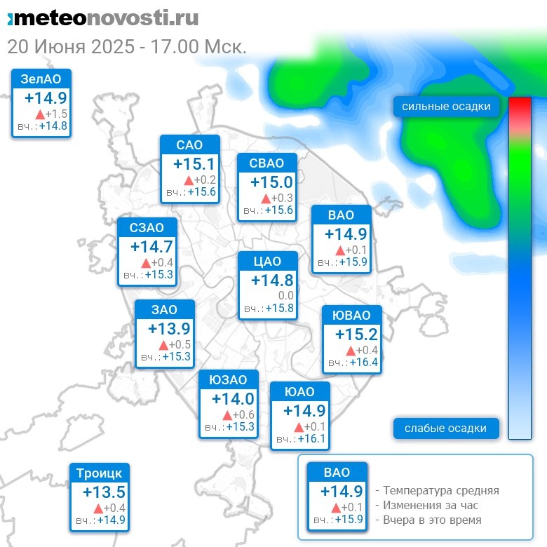 В 17:00 в Москве было от +13°C до +16.1°C, средняя температура +14.8°C #погода #Москва #лето #температура #20июня #пятница