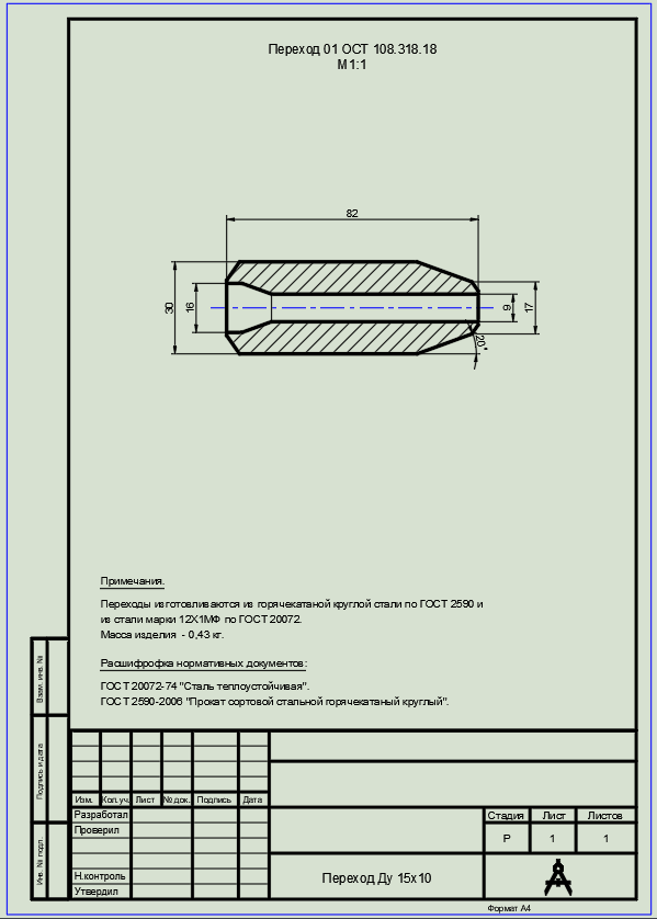 Стандарт: ОСТ 108.318.18 · Условный проход: o Большой диаметр (Dy): 15 мм o Малый диаметр (dy): 10 мм · Материал: сталь марки 12Х1МФ · Рабочее давление: o 25,01 МПа (255 кгс/см²) при температуре 545°С o 13,73 МПа (140 кгс/см²) при температуре 560°С o 13,73 МПа (140 кгс/см²) при температуре 545°С · Наружный диаметр и толщина стенки: o D: 28 мм o d: 16 мм · Основные размеры: o Длина перехода (L): 30 мм o Высота (H): 17 мм · Предельные отклонения: o L: +0,5 мм o H: +0,43 мм · Тип соединения: под приварку · Форма перехода: плавный переход между диаметрами · Технология изготовления: точение · Основное назначение: для паропроводов тепловых электростанций · Условия эксплуатации: o Высокая температура o Высокое давление o Агрессивная среда · Способ монтажа: сварка · Контроль качества: обязательный контроль сварных соединений · Подготовка: необходимо соблюдать технологию сварки для стали 12Х1МФ · Высокая прочность благодаря материал