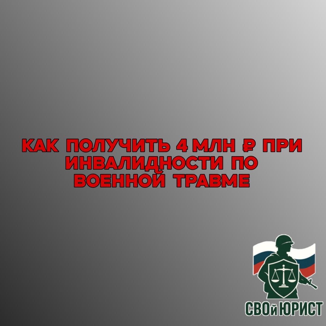 ## 💰 Как получить 4 МЛН ₽ при инвалидности по военной травме 🇷🇺 СВОй Юрист — на связи. Эта выплата — не «плюс» к 3 млн, а часть той же государственной поддержки. Получается так: ### 1️⃣ Закон — что говорится официально * Согласно Указу Президента РФ от 14 ноября 2024: * если из-за ранения получена инвалидность, сумма выплаты доходит до 4 млн ₽ (3 млн + 1 млн) ([mlds.ru][1], [xn--90aivcdt6dxbc.xn--p1ai][2], [kp.ru][3]). * Это единая разовая выплата, а не ежемесячное пособие или региональная надбавка. --- ### 2️⃣ Кто и когда получает 4 млн рублей * Военнослужащий (контрактник, мобилизованный или доброволец) с СВО * Получил инвалидность I–III группы * Справка от ВВК обязательно содержит формулировку «инвалидность вследствие военной травмы» ([kp.ru][3], [vedomosti.ru][4], [domsovet.tv][5]). > Важно: МСЭ (соцэкспертиза) сама по себе не даёт право на выплату — нужен именно вывод ВВК. --- ### 3️⃣ Пошаговый план получения выплаты | Шаг | Действие