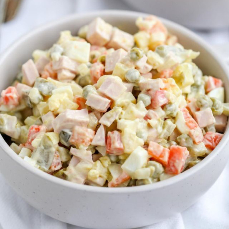 **Классический рецепт салата Оливье (советская версия)** Этот салат — неизменный атрибут новогоднего стола и праздников в России и странах СНГ. Вот проверенный рецепт: **Ингредиенты (на большую миску):** 1. **Картофель:** 4-5 шт. средних (вареный в мундире, охлажденный, очищенный) 2. **Морковь:** 2-3 шт. средних (варенная, охлажденная, очищенная) 3. **Яйца куриные:** 4-5 шт. (сваренные вкрутую, охлажденные, очищенные) 4. **Огурцы соленые (бочковые/маринованные):** 4-5 шт. средних 5. **Горошек консервированный:** 1 банка (около 400г, слить жидкость) 6. **Колбаса вареная ("Докторская"):** 300-400 г (классический выбор, можно заменить на отварную курицу, говядину, язык или ветчину) 7. **Майонез:** 200-250 г (лучше использовать классический провансаль, не легкий) 8. **Соль:** по вкусу 9. **Перец черный молотый:** по вкусу (опционально) 10. **Зеленый лук или укроп:** для украшения (опционально) **Приготовление:** 1. **Подготовка:** Убедитесь, что картофель, морковь и яйца сварены, пол
