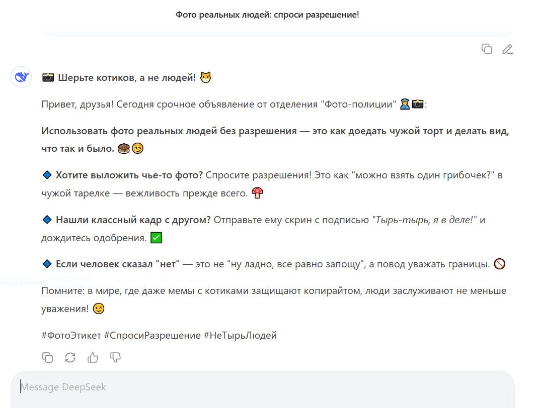 Попросила DeepSeek написать пост о том, почему нельзя без спроса постить чужие фоточки, и получила неожиданно классный результат. Вы его видите на картинке. ИИ абсолютно прав! Это чуть ли не первый случай в моей практике, когда нейросеть создаёт юридический текст и не ошибается. Но, конечно, я хочу более подробно объяснить, почему нельзя размещать фотографии других людей у себя в соцсетях, на сайтах, на футболке или каблуках и вообще нигде, где могут увидеть посторонние. Первое: это прямо запрещено Гражданским кодексом РФ. Статья 152.1 ГК РФ: «Обнародование и дальнейшее использование изображения гражданина (в том числе его фотографии, а также видеозаписи или произведения изобразительного искусства, в которых он изображен) допускаются только с согласия этого гражданина». Есть исключения, есть. Но без острой необходимости этими исключениями лучше не пользоваться. Например, разместив фото в общественных интересах (что ГК разрешает), вы потом устанете доказывать наличие этого общественного