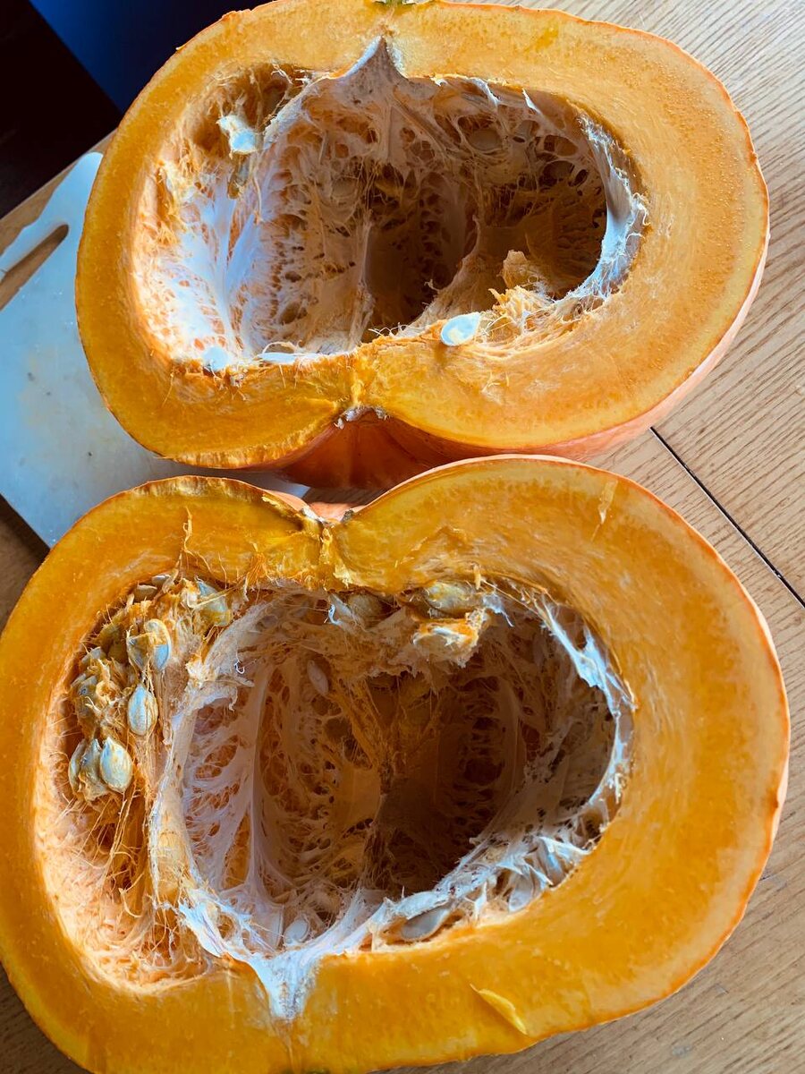 Моя соседка 🥰 по осени, а именно в сентябре, угостила меня тыквами двумя. Одну мы как-то сразу приговорили, в кашу, оладьи и заморозила остатки. А вторая осталась лежать в подсобном помещении. Очень уж большая была.