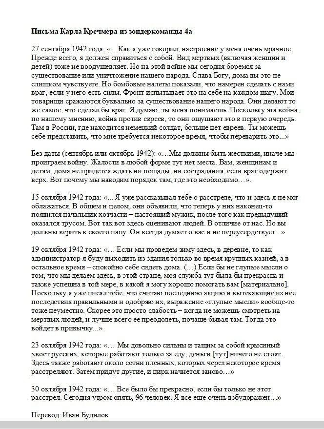К статье о преступлениях зондеркоманды 4а (айнзацгруппа С) на оккупированных территориях РФСР и УССР – публикуем документальные свидетельства, проливающие свет на ситуацию в зоне действия этого подразделения. На суде над членами зондеркоманды 4а в 1969 году присяжным было представлено несколько найденных в квартире обвиняемого Карла Кречмера писем, написанных жене осенью 1942 года во время службы в Курске. В конце сентября и весь октябрь Кречмер пишет о расстрелах советских жителей, в которых, занимая в зондеркоманде административную должность, все равно должен участвовать, доказывая таким образом сослуживцам, что он настоящий мужчина – в отличие от своего предшественника, «который оказался трусом». Ему тяжело смотреть на мертвецов, среди которых женщины и дети, однако он надеется преодолеть эту «слабость», «почаще бывая там», чтобы вид трупов вошел в привычку. И считает массовые убийства гражданского населения правильными. Ведь, несмотря на неприятные ощущения и некоторые сомнения, он