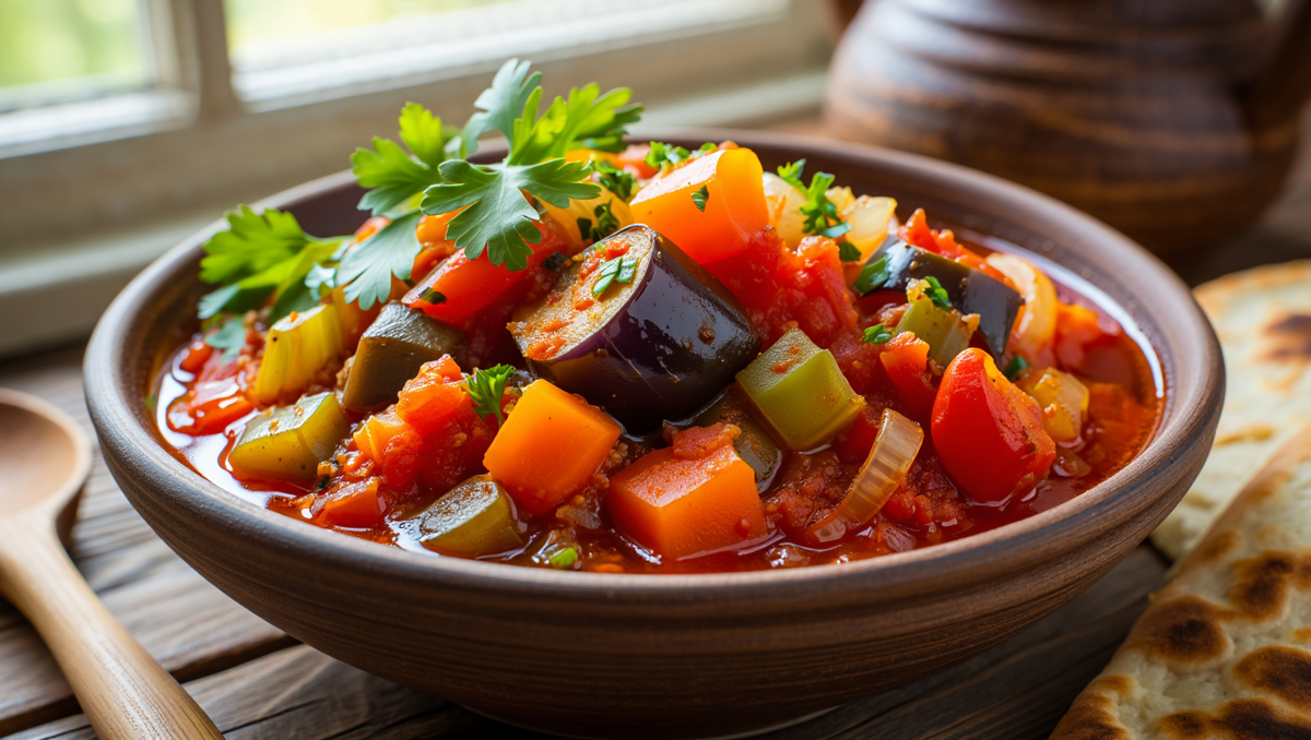Этот рецепт — мой фаворит, когда хочется чего-то лёгкого, но сытного и очень ароматного. Аджапсандали — это грузинское овощное рагу, которое идеально подходит для летнего обеда или ужина.