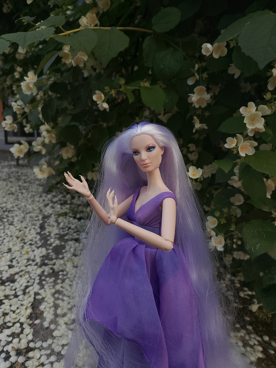 Нда, это что-то из рода "Дед Мороз и лето". Только Дед Мороз хотел лето увидеть, а Кристалл – нет. Пожалуй, это единственная кукла, которую на прогулку пришлось вести уговорами и посулами. Обычно все с радостью бегут, и даже сами требуют. А Кристалл ни в какую не хотела идти😒 И одежда ей никакая не нравится. Характерец у дамочки тот ещё ледянущий... Даже Адалинда сговорчивей. Согласилась она выйти только в своём родном платье, и только когда я объяснила, что съëмки будут проходить среди опавшего белого цвета, похожего на снег. Говорю – ну представь, что это от твоего холода цвет увял и облетел. И что вы думаете – королевишна моя охотно направилась к кусту🙈 безобразница! Правда, после дождя цвет весь грязный🙈 Фотографировать Кристалл ОЧЕНЬ сложно. Очень! Зато какие у неё волосы... Шелковистые, такие приятные на ощупь, и относительно послушные. Эх, чтож не сделали такие волосы Адалинде... После съёмок с опавшим цветом я хитростью и обманом завела Кристалл в ромашки. Её не впеч