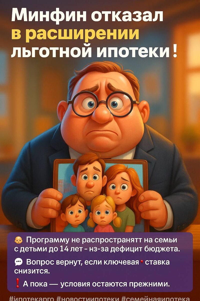 ⚡️ Минфин отказал в расширении льготной ипотеки! 👶 Программу не распространят на семьи с детьми до 14 лет — из-за дефицита бюджета. 📉 Потенциальные 7 млн семей — мимо льготы. 💬 Вопрос вернут, если ключевая ставка снизится. ❗️А пока — условия остаются прежними. #ипотекаpro #новостиипотеки #семейнаяипотека