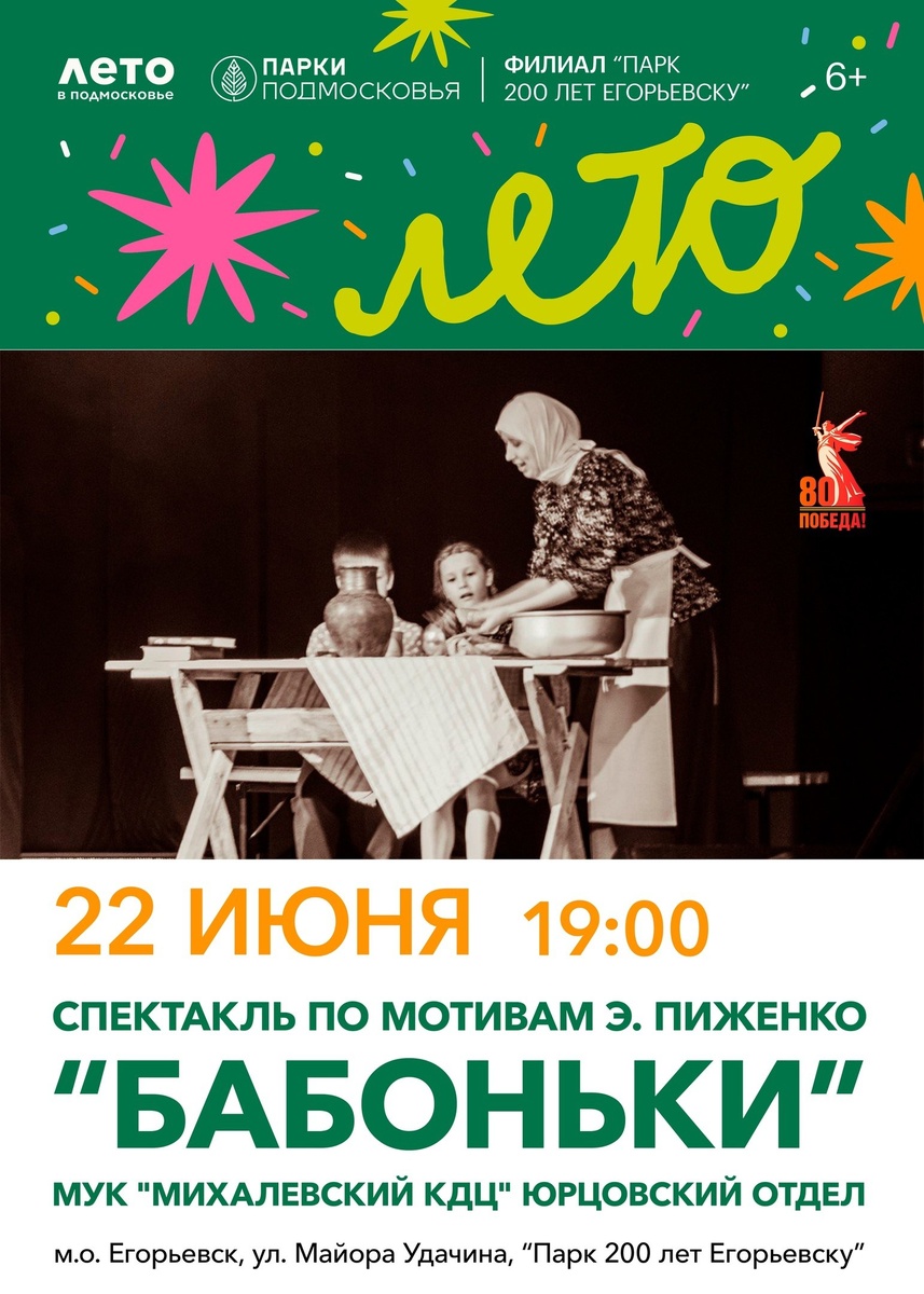 Парк «200 лет Егорьевску» приглашает на спектакль «Бабоньки» Спектакль «Бабоньки» по пьесе Эвелины Пиженко приурочен к 80-летию Победы советского народа в Великой Отечественной войне. Это трогательная история о судьбе женщин-колхозниц в военные годы. В центре действия – две соседки, которые, казалось бы, не слишком ладят друг с другом. Каждой из них пришлось проводить мужей на фронт, и теперь им остаётся взять на себя всю мужскую работу как дома, так и в колхозе. В условиях тяжёлых испытаний прошлые обиды и невзгоды кажутся слишком мелкими на фоне всеобщего горя, имя которому – война. Дата и время спектакля: 22 июня в 19:00 Место проведения: сцена «Корзина». Возрастные ограничения: 6+ #подмосковье #НашеПодмосковье #муниципальныйокругЕгорьевск #моЕгорьевск #егорьевскоетелевидение #егорьевскоетв #Егорьевск #администрацияегорьевск
