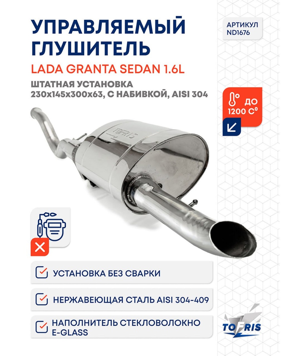 Внимание, новинка! Управляемый глушитель для Гранта Седан, штатная установка 230х145х300х63 мм., представляет собой инновационное решение для владельцев автомобилей LADA Granta Sedan — это глушитель с изменяемой конфигурацией громкости выхлопа, который устанавливается вместо штатного глушителя без доработок(BOLT-ON). Преимущества • Возможность регулировать звук выхлопа «тихо-громко» • При использовании управляемого глушителя, в прямоточном режиме, улучшаются разгонные характеристики, мощность двигателя увеличивается на 12-15 л.с. • Управление заслонками происходит с помощью радио-пульта. Менять звук выхлопа можно прямо из салона автомобиля. • Улучшение акустического комфорта в салоне автомобиля; • Премиальный внешний вид; • Повышенная долговечность благодаря использованию нержавеющей стали Материалы: корпус и внутренности изготовлены из нержавеющей стали AISI 304, что обеспечивает устойчивость к коррозии и, соответственно, длительный срок службы даже в условиях агрессивной среды. Пер