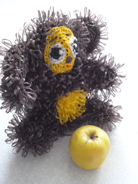 Понадобятся полипропиленовые нити коричневого,жёлтого,немного белого,черного цветов .Крючок номер 2 или 3, ножницы , игла для пришивания . Голова Уши Руки Лицо Глаза Сборка Пришить уши,руки,ноги,глаза. Вышить коричневой нитью нос, брови. Красной нитью вышить рот.