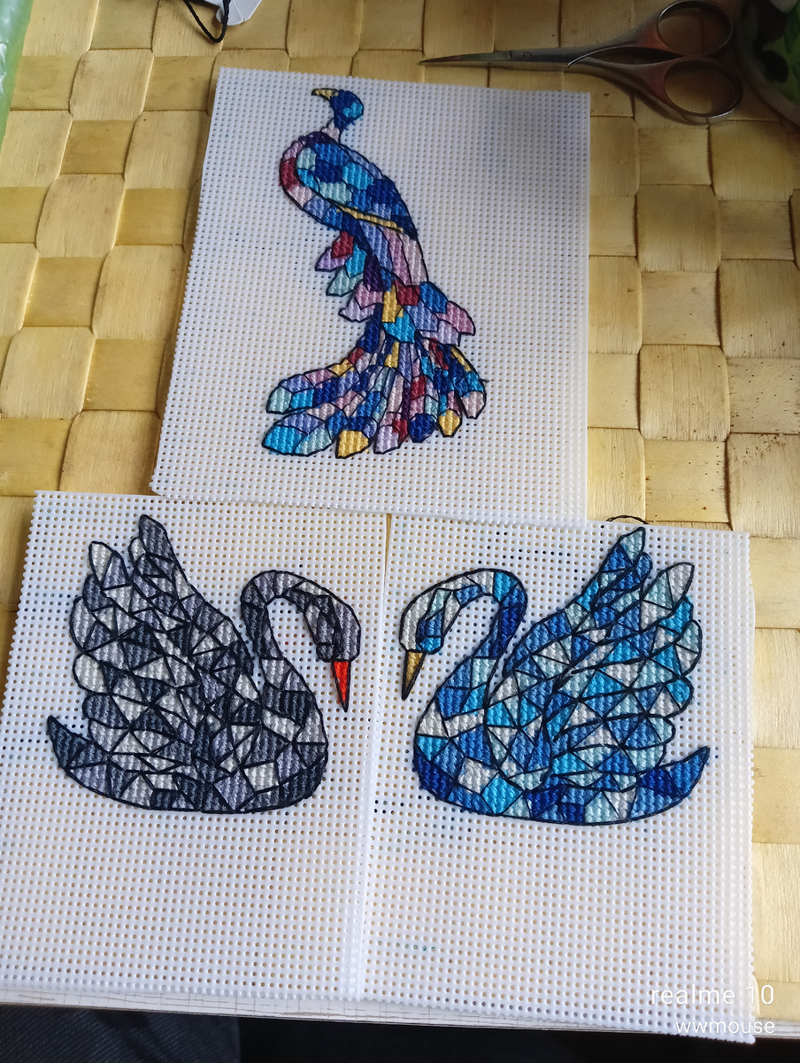 Итак, витражная серия была определена как дачная. Минимум усилий, максимум пафоса) План был простой - собрать нитки и вышивать на даче по два витража. Если бы я в этот момент прислушалась, то я бы услышала хихиканье сверху.... Внимательно собрав нитки, я приехала на дачу. Вот что могло пойти не так? Например.... Всё))) Я начинаю вышивать витраж и на 30 % отшива, понимаю, что закончился один цвет.... Я откладываю его, беру другой... На 20 % отшива у меня заканчивается другая нитка... И вот вообще не смешно, потому что в следующие две поездки ситуация ПОВТОРИЛАСЬ. Да-да, именно так... Я внимательно собирала нитки, а на даче они заканчивались!!! Т.е. я одновременно вышивала несколько витражей по частям... И пугала дизайнера массовыми финишами... Наверное, она думала, что я не ем и не сплю, нет, я просто как тот суслик)) Суслики очень внимательные животные. Смотрят вдаль - не ползёт ли змея, не летит ли орёл... Самые внимательные получают бампером в лоб.... Но во всём есть свои плюсы.
