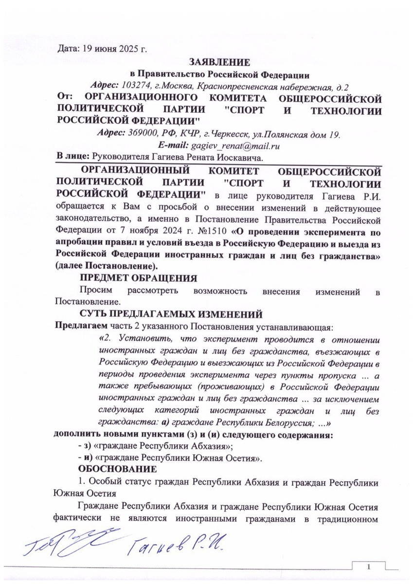 Представитель партии «Спорт и технологии РФ» Ренат Гагиев обратился в правительство России с просьбой не вводить для граждан Южной Осетии и Абхазии экспериментальные правила электронной регистрации иностранцев. (@aiasharaabh)