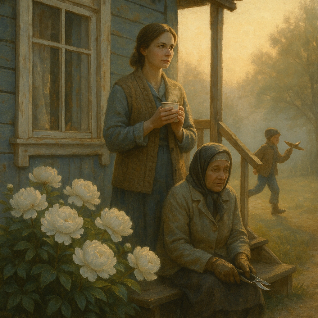 Когда зацвели пионы — пышно, молочно, с ярко-зелёными листьями — Валентина Андреевна вышла к клумбе рано утром, ещё в халате. Она сорвала один цветок и принесла его Алине.
