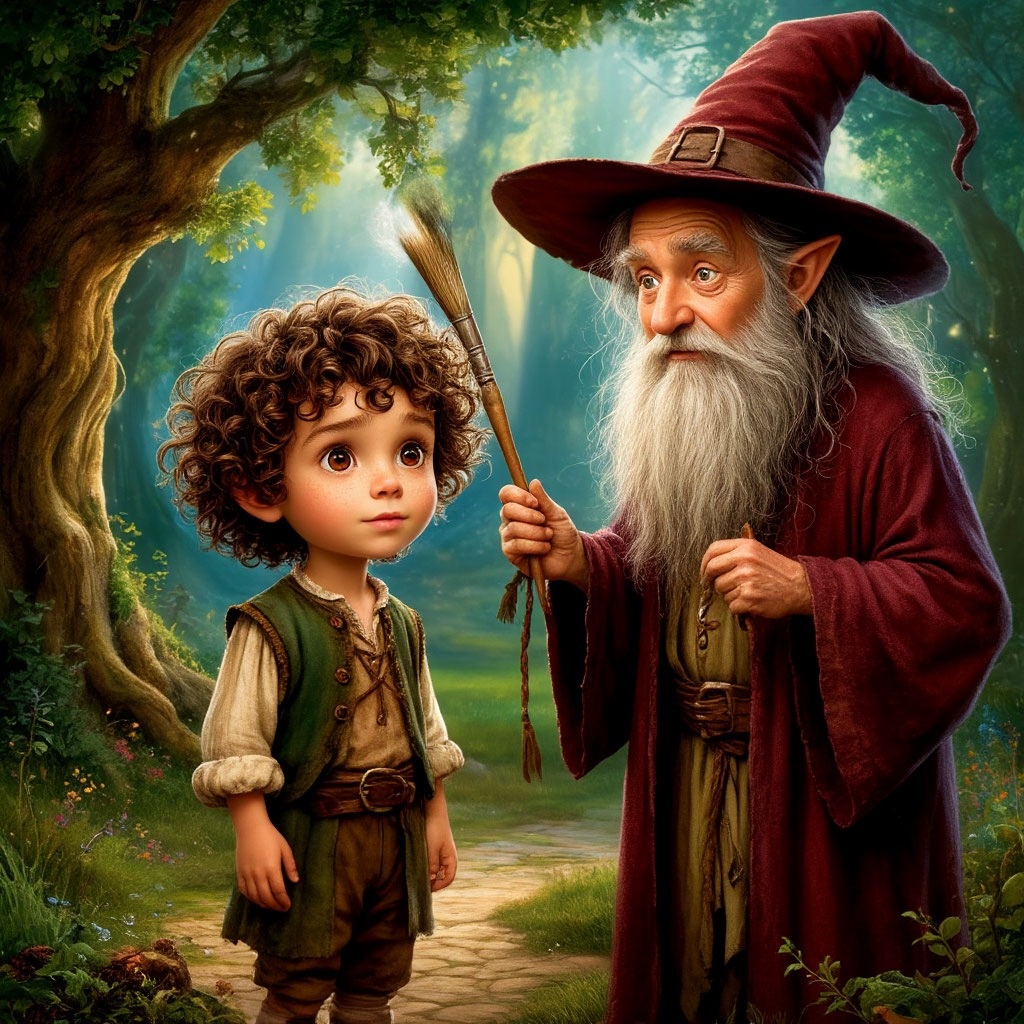 Когда последняя звезда медленно погасла, Луми почувствовал, что ночь уходит. Он попрощался с Лунным зверем, поблагодарил за чудеса и шагнул вперёд - в сторону нового света. Скоро он оказался на вершине мягкого холма, покрытого пушистой травой. Здесь всё было окрашено в нежно-серебристые и розовые тона, будто мир затаил дыхание, ожидая чего-то важного. И вдруг он увидел необычную фигуру. Перед ним стоял человек… нет, скорее волшебник, с огромной кистью в руке. Он медленно взмахивал ею по небу, и каждый мазок превращался в цвет: сначала нежно-розовый, потом золотой, затем - оранжево-коралловый. — Кто ты? — прошептал Луми, не в силах оторвать глаз. — Я — Художник рассвета, — спокойно ответил волшебник. — Каждый день я рисую новое утро. И каждое утро — особенное. Но сегодня мне не хватает одного цвета… — Какого? — Луми сразу захотел помочь. — Цвета доброго поступка. Только он завершает картину рассвета. Луми задумался. И тут заметил рядом маленькую птичку, которая запуталась в паутинке ме