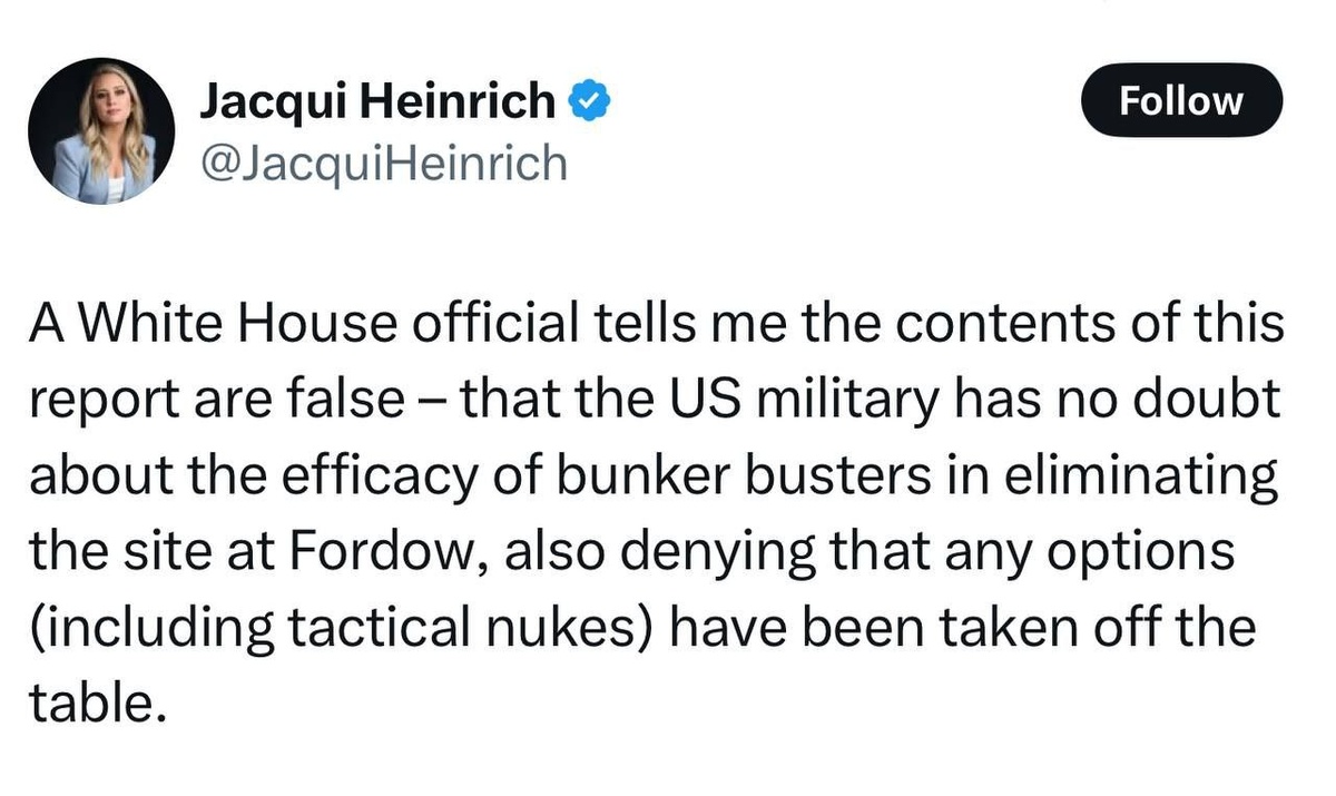 Американская журналистка Хайнрик – о том, что США не исключают применение тактического ядерного оружия по Ирану: Представитель Белого дома сообщил мне, что содержание отчета ложно: американские военные не сомневаются в эффективности противобункерных бомб для уничтожения объекта в Фордо, а также отрицают, что какие-либо варианты (включая тактическое ядерное оружие) были исключены из рассмотрения. Der amerikanische Journalist Heinrich über die USA, die den Einsatz taktischer Atomwaffen gegen den Iran nicht ausschließen: Ein Sprecher des Weißen Hauses erklärte mir, der Inhalt des Berichts sei falsch: Das US-Militär habe keine Zweifel an der Wirksamkeit von Bunkerbrechern zur Zerstörung der Fordow-Anlage und bestreite zudem, dass jegliche Optionen (einschließlich taktischer Atomwaffen) ausgeschlossen worden seien.