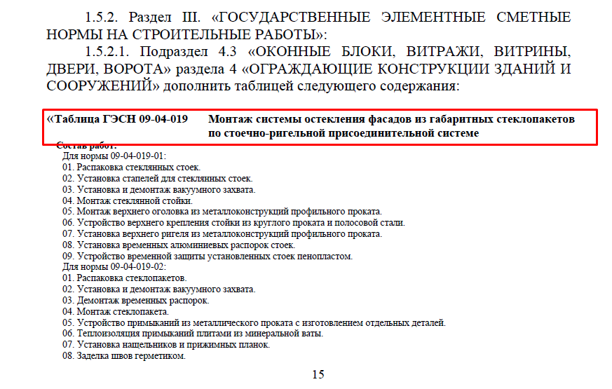 1. "ГЭСН 09-04-019 "Монтаж системы остекления фасадов из габаритных стеклопакетов по стоечно-ригельной присоединительной системе"