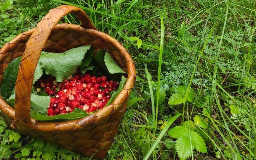 И тут лес мне подарил совсем не то, за чем я сюда пришла, но не менее привлекательное. Я вышла на поляну с земляникой! В азарте найдя несколько листьев лопухов, и застелив корзинку, я принялась за сбор этой ароматной лесной годы.