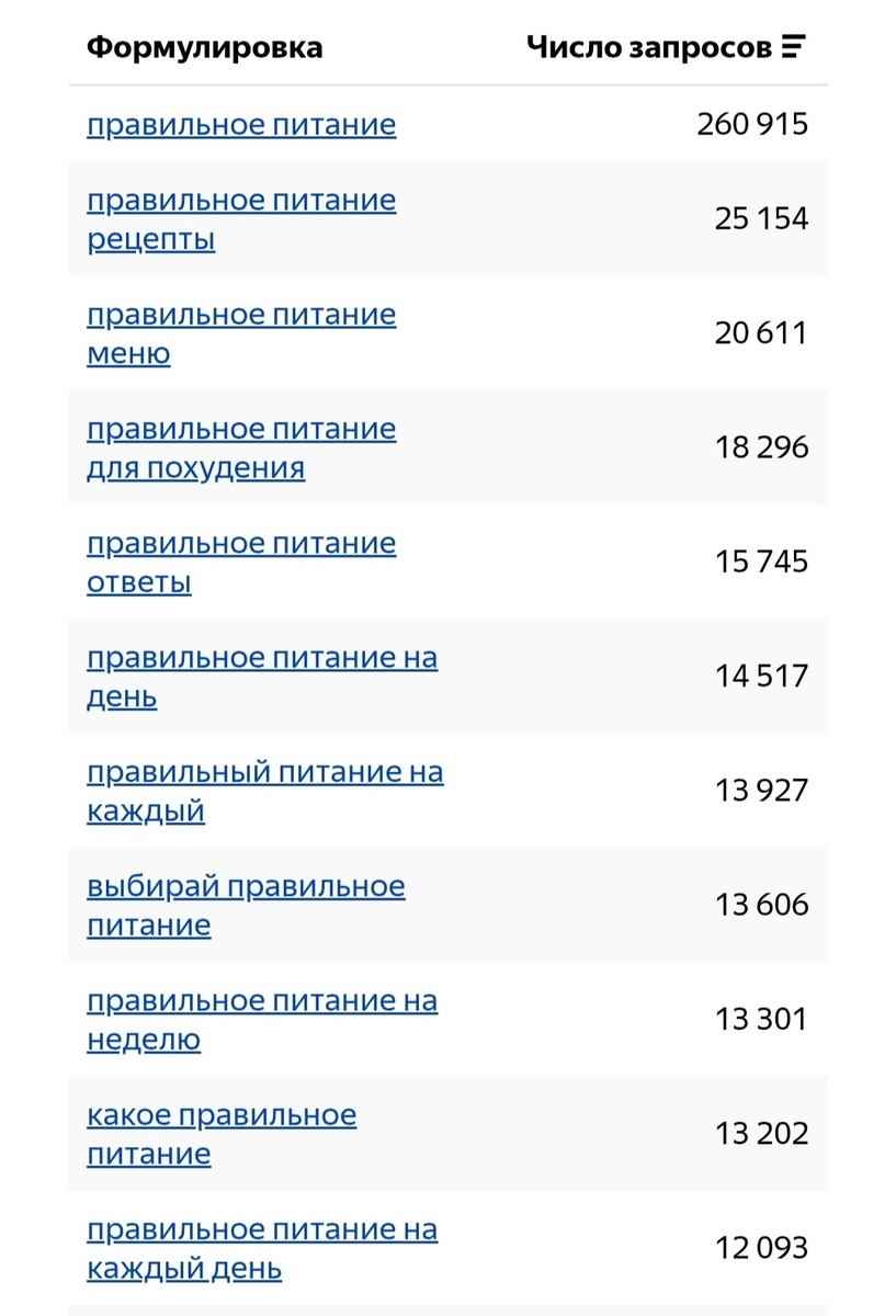 SEO-оптимизация (Search Engine Optimization), или просто SEO, — это комплекс мер, направленных на улучшение поиска статьи или канала в результатах органического (бесплатного) поиска поисковых систем, таких как Google, Яндекс и др. Цель SEO - сделать сайт более привлекательным для поисковых систем, чтобы он отображался выше в результатах поиска по определенным ключевым словам и фразам, связанным с тематикой сайта. Чтобы узнать, какие слова наиболее популярны у пользователей, достаточно воспользоваться ресурсом Wordstat, и ввести в поисковую строку слово или предложение. Так, например, введя "правильное питание" мы видим 260 915 запросов А запрос "как похудеть" даёт уже 452 233 отклика. Хотя и "правильное питание" и "как похудеть" может содержать похожую информацию, и быть одинаково интересны одному и тому же пользователю. Эту разницу нужно учитывать, создавая заголовки и статьи. Как посмотреть основные отчёты в Яндекс.Метрике можно почитать здесь С середины мая я начала уделять больше