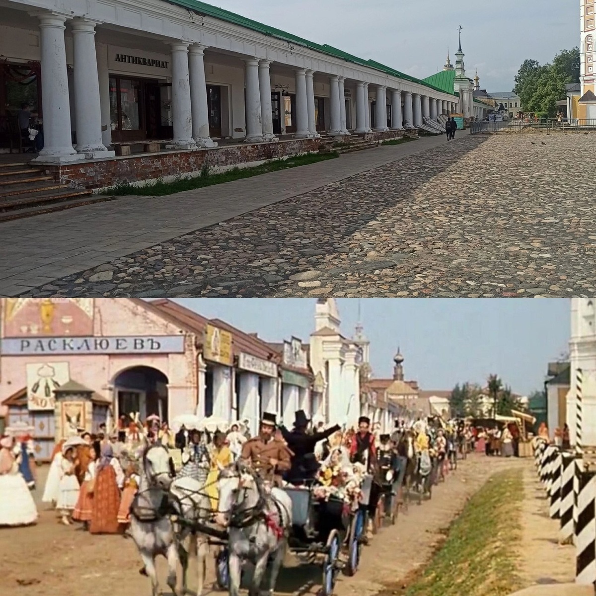 6/8 На данном кадре из фильма Бальзаминов едет в свадебном кортеже рядом с Торговыми палатами Суздаля (1811 год). Историческое здание Торговых палат намного меньше, как писал ранее, в 70-е годы здание в рамках реставрации было перестроено. Сегодня в помещениях Торговых палат находятся рестораны и магазины для туристов.