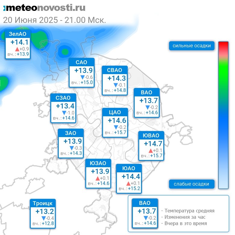В 21:00 в Москве было от +13.1°C до +15°C, средняя температура +14°C #погода #Москва #лето #температура #20июня #пятница